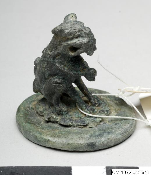 Det här sigillet består av en rund bottenplatta och ett handtag i form av ett sittande djur, möjligtvis ett lejon. Handtaget är placerat på en något upphöjd bas med flikiga kanter, mitt på bottenplattan. Djurets öron, ögon, näsa och till och med tänder är utmärkta. Ett pärlband är knutet runt djurets hals. Inristade streck på halsen föreställer päls. Lockiga pälsslingor på den långa svansen är noggrant tecknade. Ett hål har borrats genom huvudet vid munnen och var troligtvis till för att fästa ett snöre vid sigillet. Legend i sigillskrift金氏之寶, som betyder “Sigill tillhörande familjen Gim [Kim].Ursprunget till de koreanska sigillen hittar man i Kina, där man vet att sigill har används åtminstone sedan Handynastin (206 f.Kr – 220 e.Kr). De första koreanska sigillen är från omkring trehundratalet före vår tidräkning. (De tre kungarikenas tid 57 f.Kr – 668 e.Kr). Troligtvis började sigill då användas för att intyga och bestyrka både officiella och personliga dokument, samt målningar och kalligrafier.