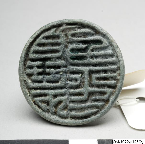 The Korean seal collection of the Museum of Far Eastern Antiquities includes 129 bronze seals and one stone seal, reflecting the diversity and craftsmanship of Goryeo seals. The shape of the bottom plates varies from circular to rectangular, and octagonal forms. Handle shapes include simple loops on top of the bottom plate, vertical flat handles (the majority shaped in the form of a yeouidu – a cloud-shaped symbol for good fortune) with a hole for a cord and figurative handles in the shapes of lions, fishes, tortoises, humans or birds with a hole or loop for attaching a cord. Not all inscriptions are legible, but they can be categorized into personal seals, family seals, seals with symbols and stylized characters (for example longevity, wealth or health), seals with pictorial inscriptions and seals with an inscription indicating its function (for example the character for “sealed” (Korean: bong)). In many cases, the Chinese characters are written in a stylized form with meandering lines and adapted to fit the shape of the seal plate (Korean: gucheopjeon), but other types of seal script were likewise used. Not much is known about the production process of the seals, but their examination shows that, generally, smaller seals were cast in one piece, while larger seals have separately crafted handles that were attached to the bottom plate. Some of the inscriptions were fashioned out of several metal strips that were soldered onto the bottom plate of the seal.