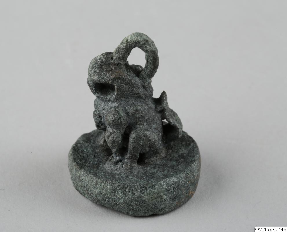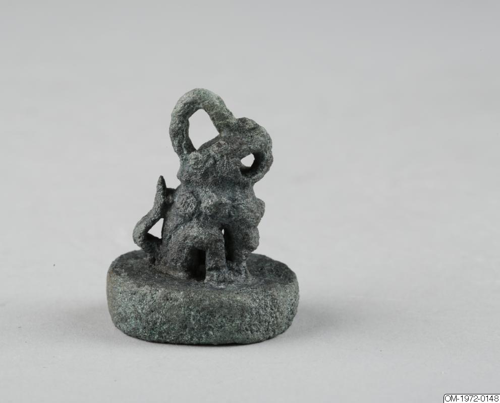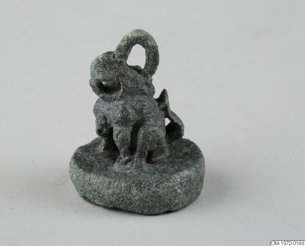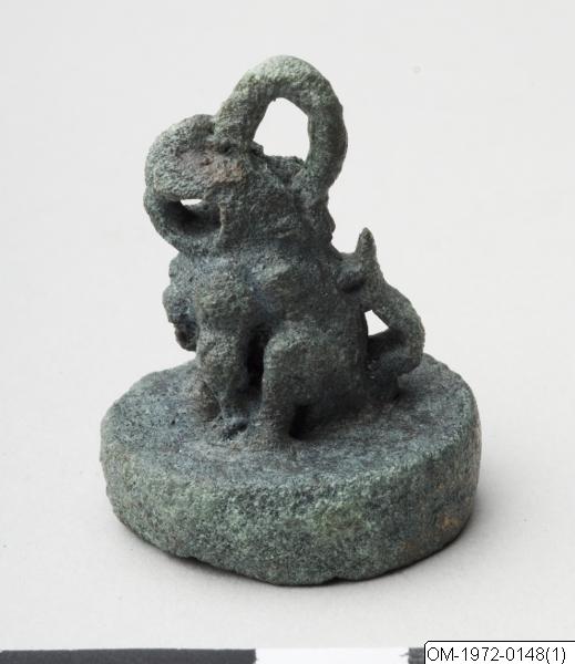 Det här sigillet har en ganska tjock, rund bottenplatta. Bottenplattan och det djurformade handtaget är kraftigt korroderat och djurets detaljerade drag går inte att uttyda. Det skulle kunna föreställa ett lejon eller en haetae. Djuret har en spetsig nos, eller horn, och en pärla på bröstet. Munnen är öppen bakom de hopbitna tänderna. På huvudet sitter en snörögla. Det geometriska snirkliga mönstret i relief på stämpelytan liknar de mönster som finns på sigillen med nummer OM-1972-0149 och OM-1972-0150, Inskriften verkar vara gjord av flera olika metallstänger som lötts fast på bottenplattan. Mönstret skulle kunna föreställa en stiliserad form av tecknet龜, “sköldpadda”. Sköldpaddan symboliserar långt liv. Ursprunget till de koreanska sigillen hittar man i Kina, där man vet att sigill har används åtminstone sedan Handynastin (206 f.Kr – 220 e.Kr). De första koreanska sigillen är från omkring trehundratalet före vår tidräkning. (De tre kungarikenas tid 57 f.Kr – 668 e.Kr). Troligtvis började sigill då användas för att intyga och bestyrka både officiella och personliga dokument, samt målningar och kalligrafier.