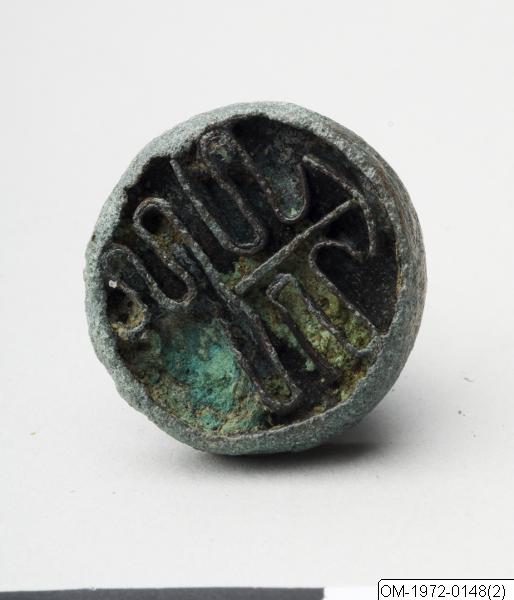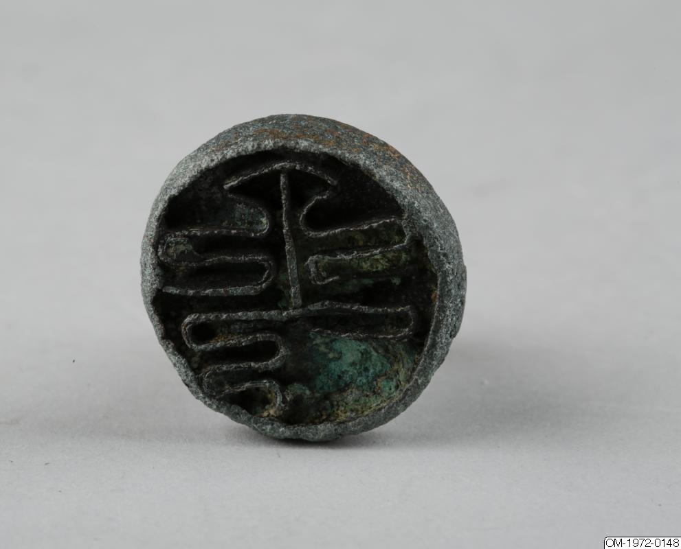 The round bottom plate of this seal is relatively thick. The bottom plate and animal-shaped handle are incrusted, and detailed features of the animal are unrecognizable. It may represent a lion or haetae. It has a pointed snout, or horn, and a pearl at the chest. The mouth is open behind closed teeth. On the head, there is a large cord-loop. The stamping surface bears a geometric pattern of meandering lines in relief, similar to those seen in the seals with the numbers OM-1972-0149 and OM-1972-0150. The inscription appears to have been fashioned out of several separate metal strips that were soldered onto the bottom plate. The pattern may represent a stylized form of the character 龜, "turtle." The turtle symbolizes longevity.