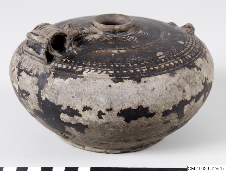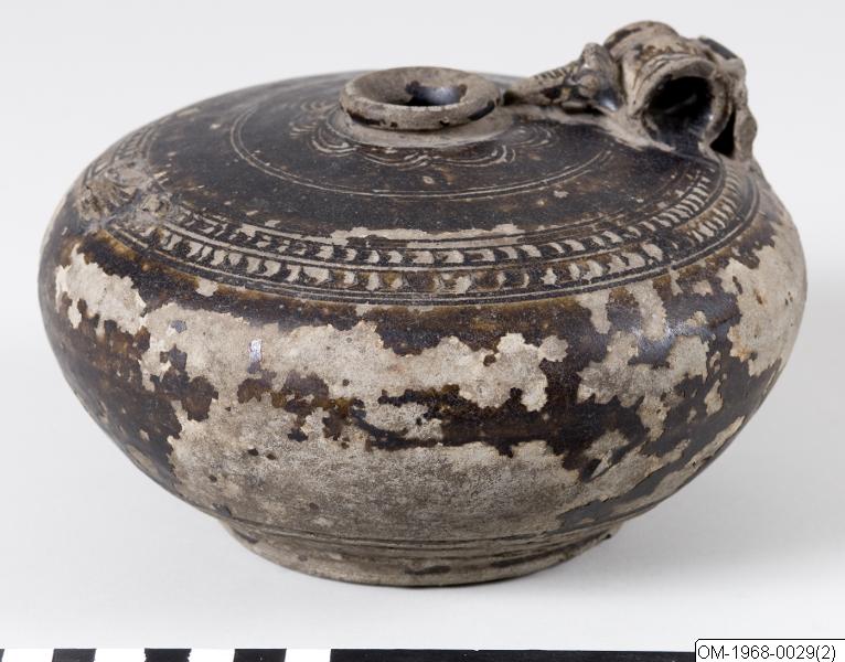 Enligt Ruth Prior är föremålet av drejat stengods, tillverkat i oxiderad bränning. Kannan kallas ibland för “honey pot” på engelska, och är ett Khmer-föremål. Dateras till 1200-talet och kan komma från Kambodja eller nordöstra Thailand. För liknande exemplar se Legend and Reality, Early Ceramics from South-East Asia av Roxanna M. Brown et al., 1978, plansch 81. Se även Khmer Ceramics from the Kamratan Collection av Hiroshi Fujiwara, 1990, s. 80-1, plansch 84 och 85.