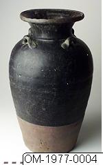 Stor kruka av glaserad keramik. Krukan har en hals med utvikt kant och fyra hänklar på skuldran. Krukan är glaserad med brunsvart glasyr som täcker ca två tredjedelar av kroppen. Basen och nedersta delen av krukan är oglaserad. På undersidan finns ett virvelmönster i vitt, medan godset i krukan är brunt/purpurfärgat.
