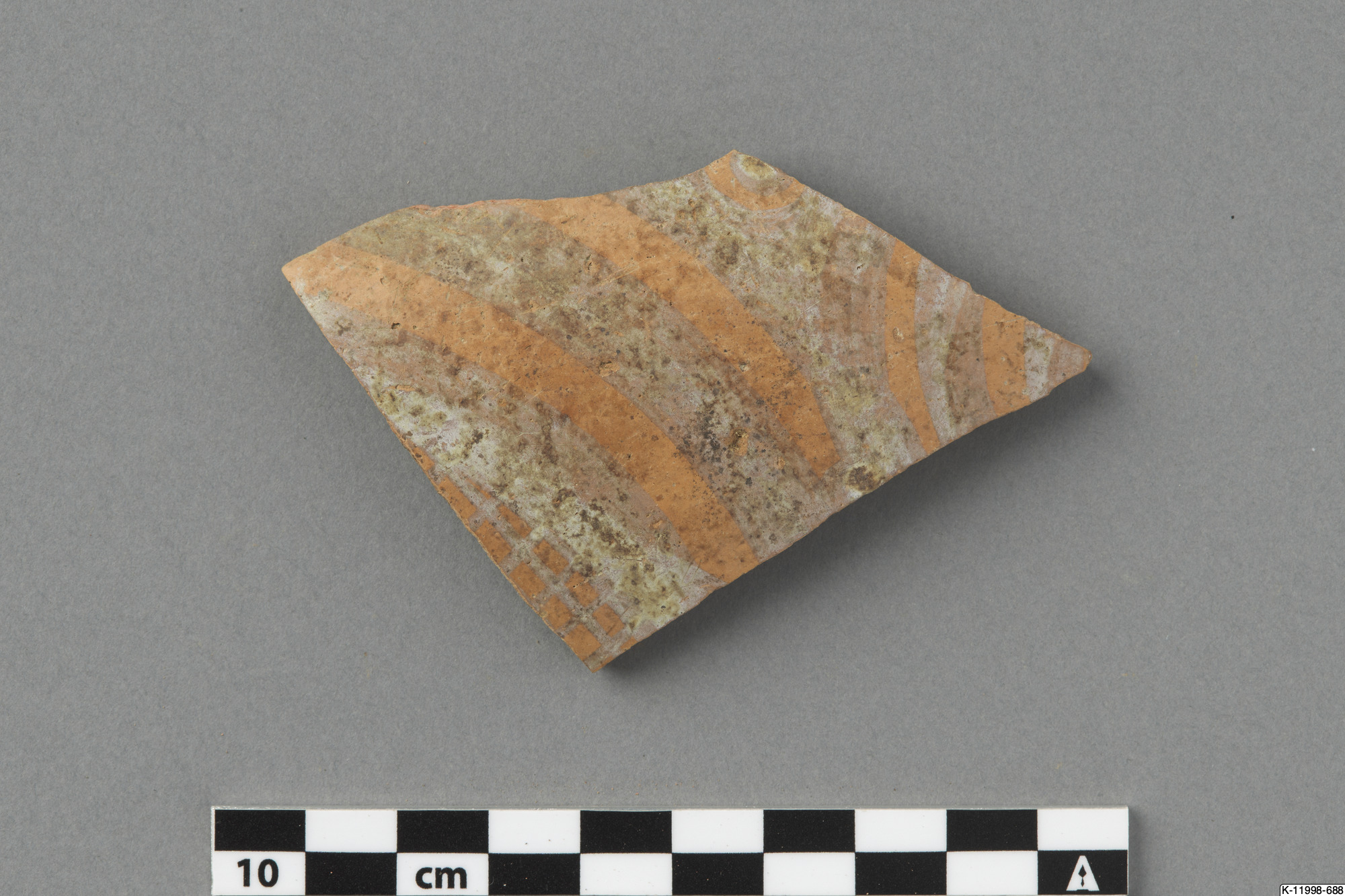 - 160 skärvor med målad dekor, alla utaom en från sidan av skålar med eller utan brädd och vaser.