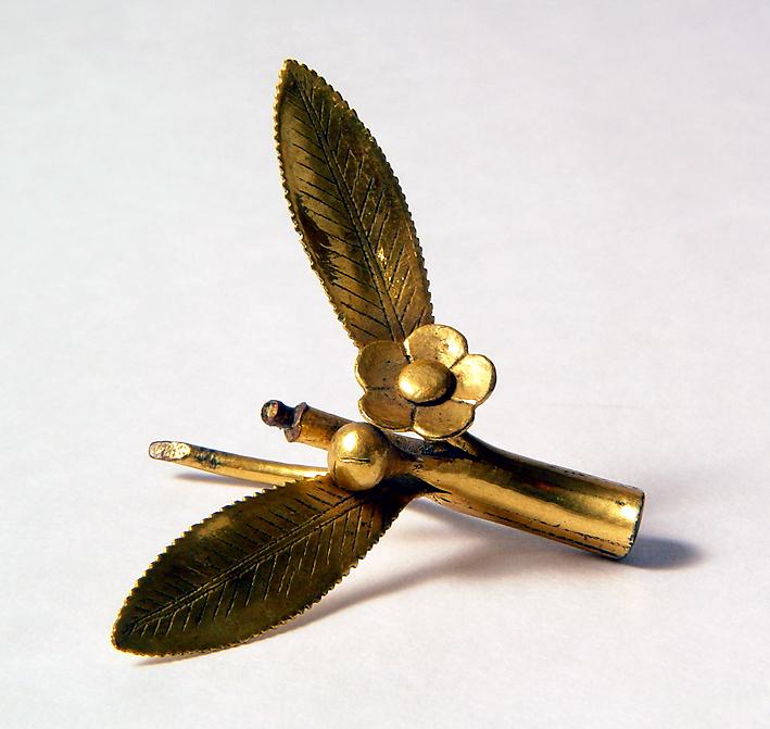 Prydnad av förgylld metall i form av prunuskvist.