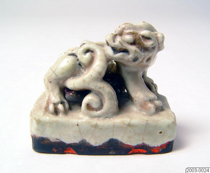 Sigill av keramik i form av djur, på undersidan spår av röd stämpelfärg.