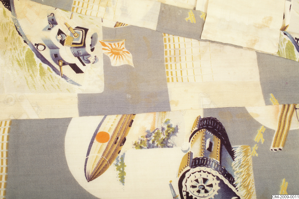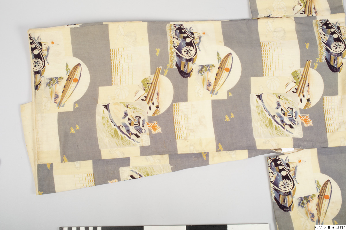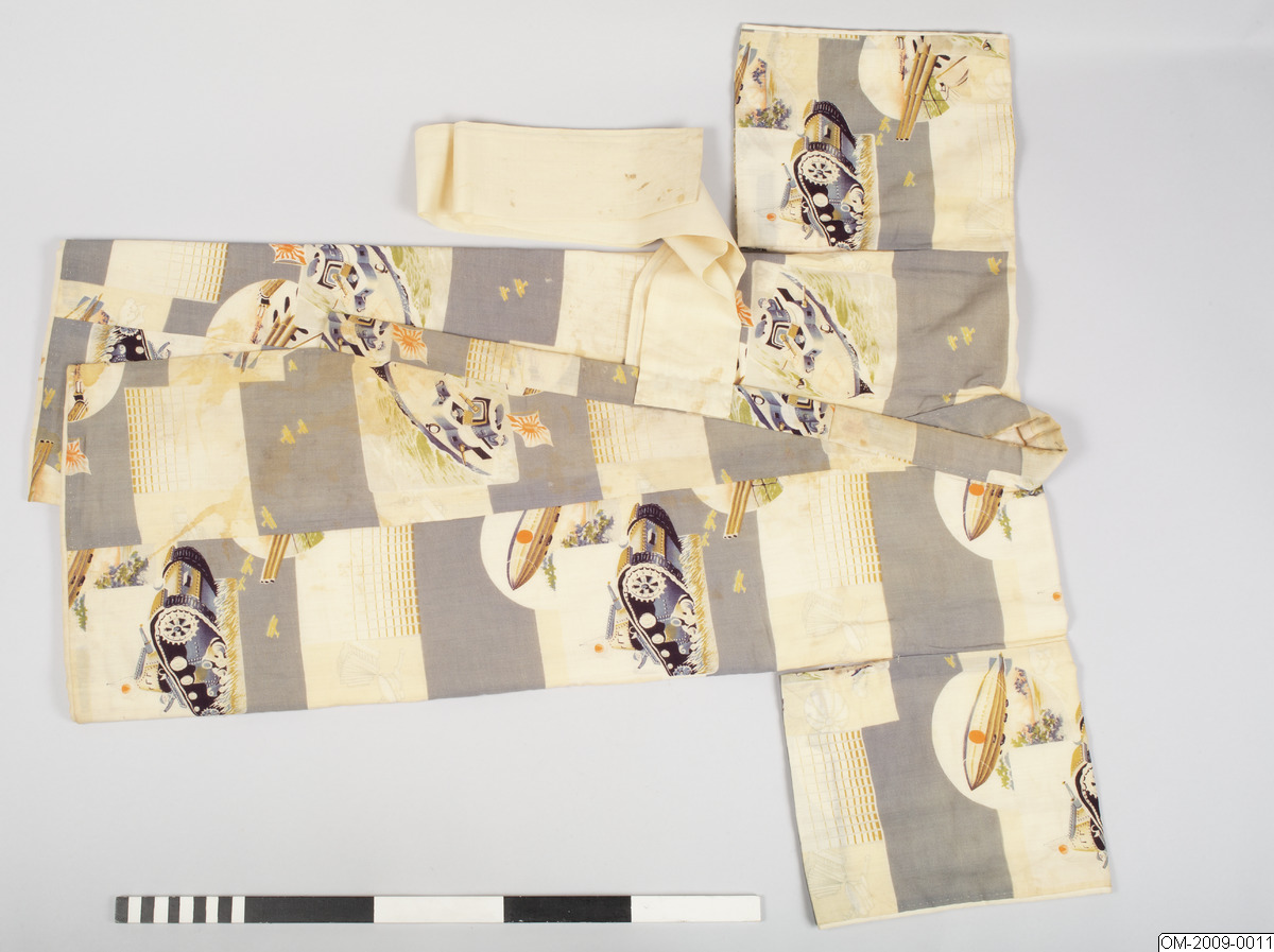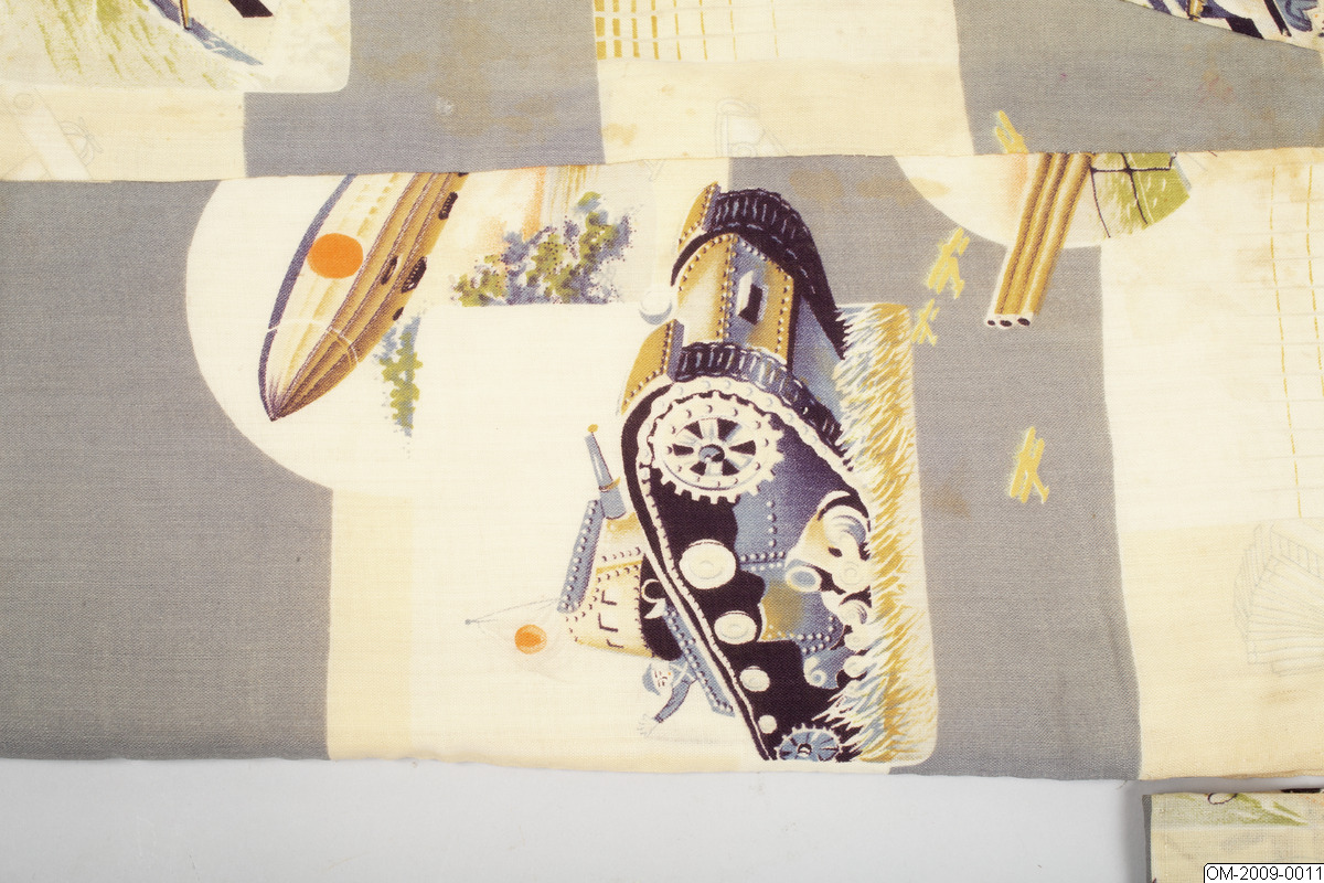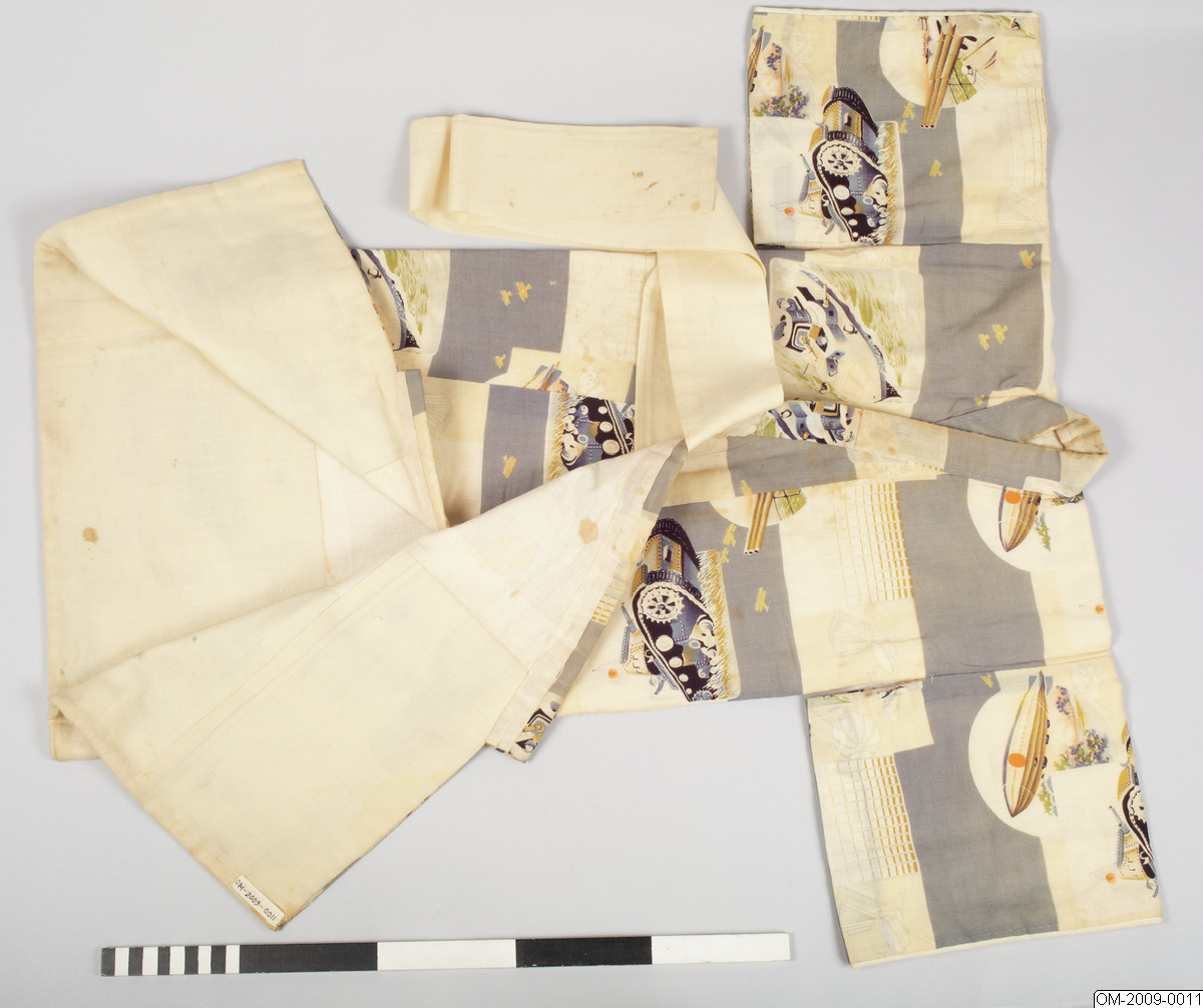 Pojk-kimono med krigsmotiv (propaganda) i form av bl a zeppelinare, krigsfartyg och tanks. Tuskaftsvävt ylletyg med tryckt mönster. 1930-40-tal.