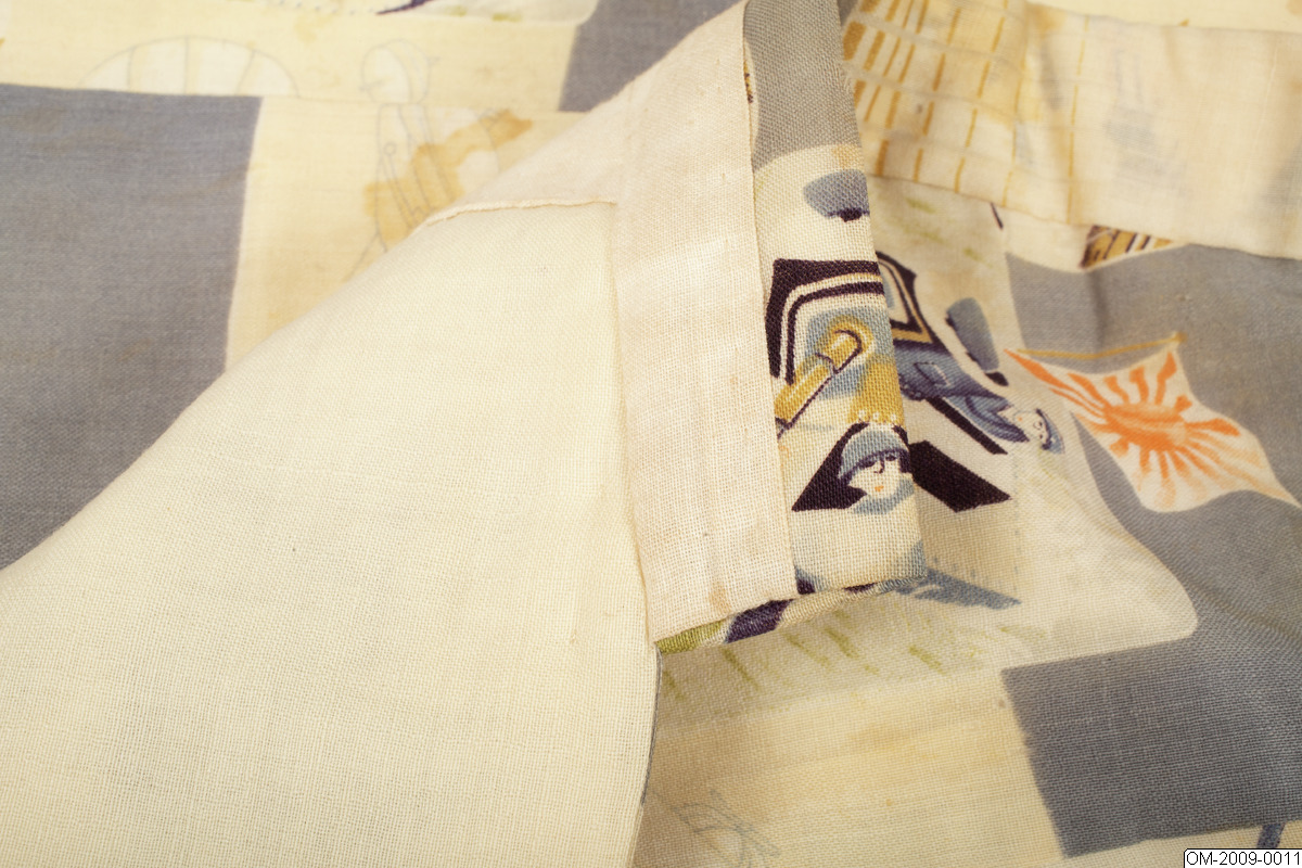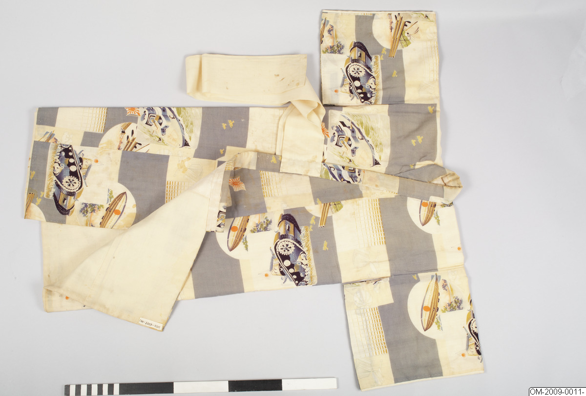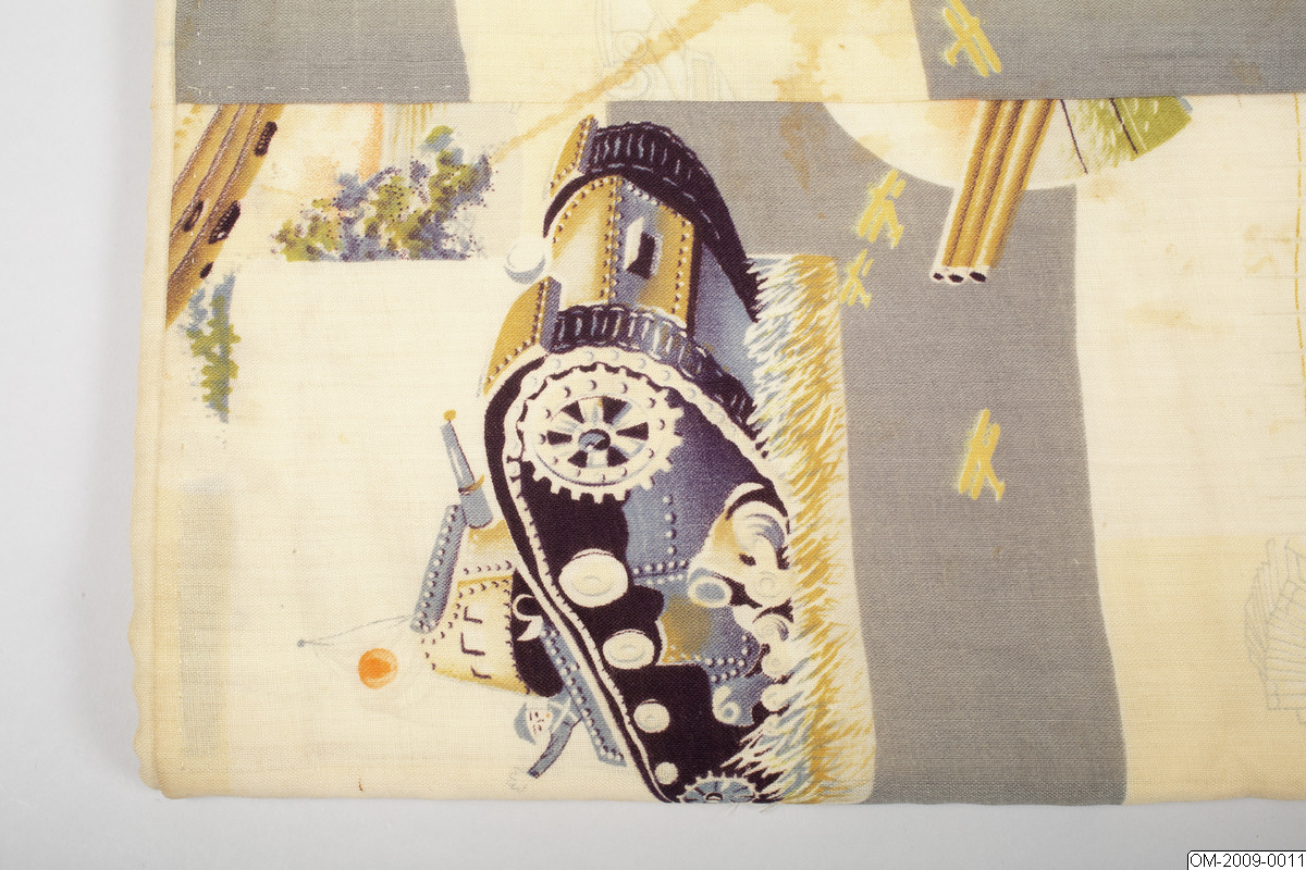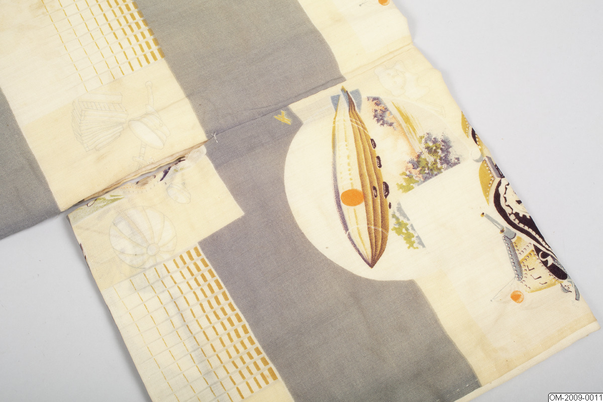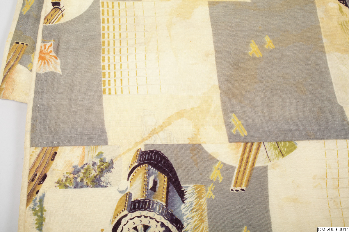 Pojk-kimono med krigsmotiv (propaganda) i form av bl a zeppelinare, krigsfartyg och tanks. Tuskaftsvävt ylletyg med tryckt mönster. 1930-40-tal.