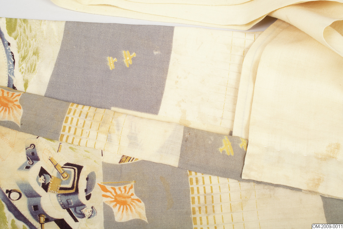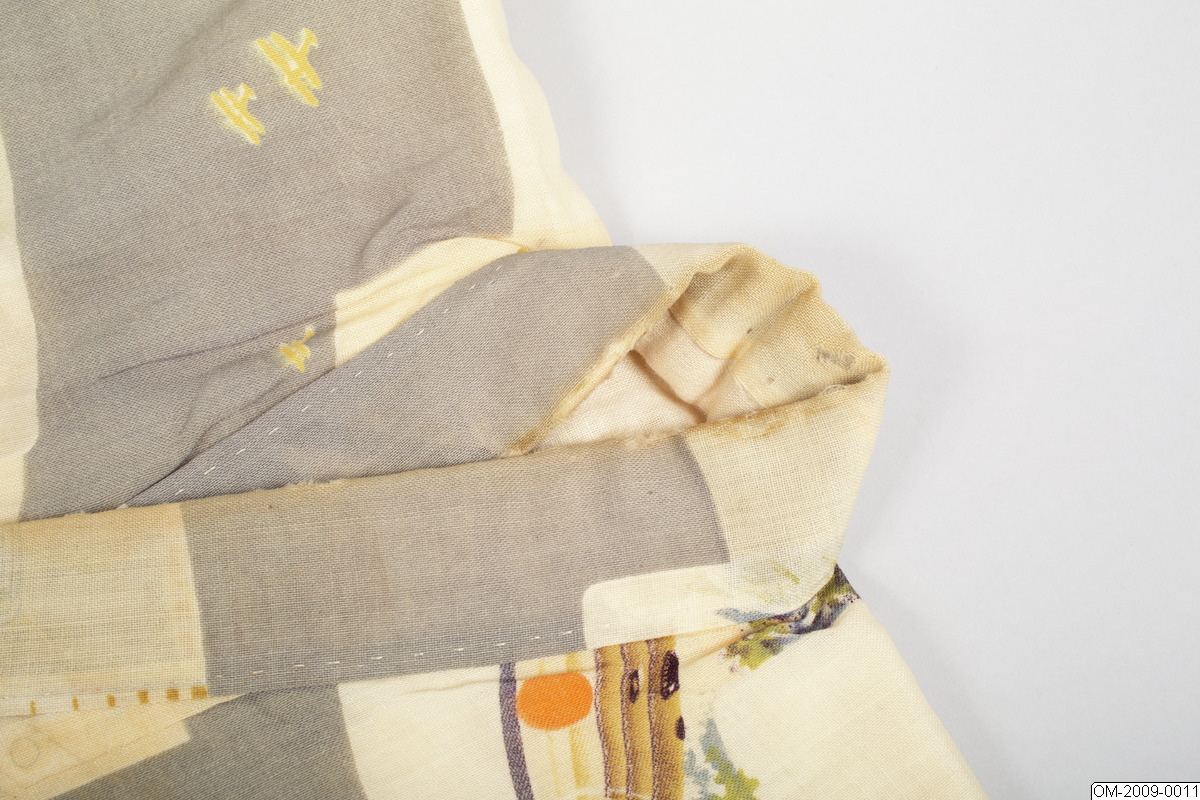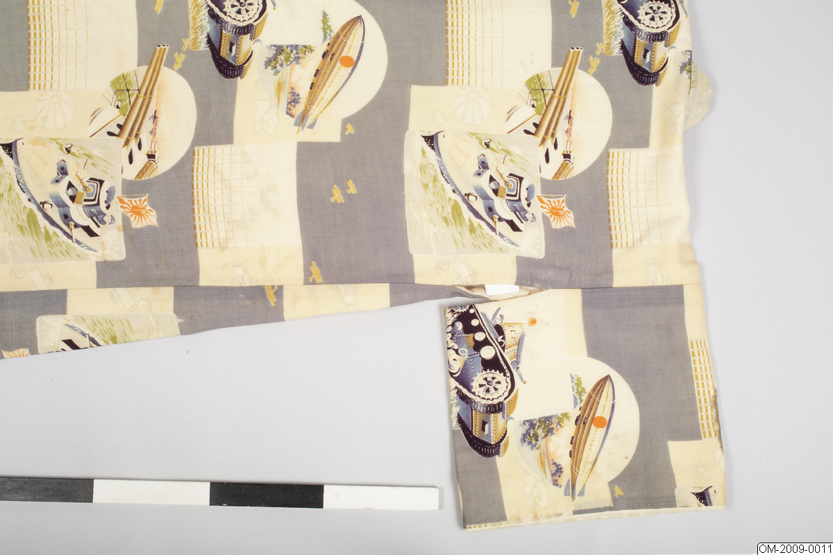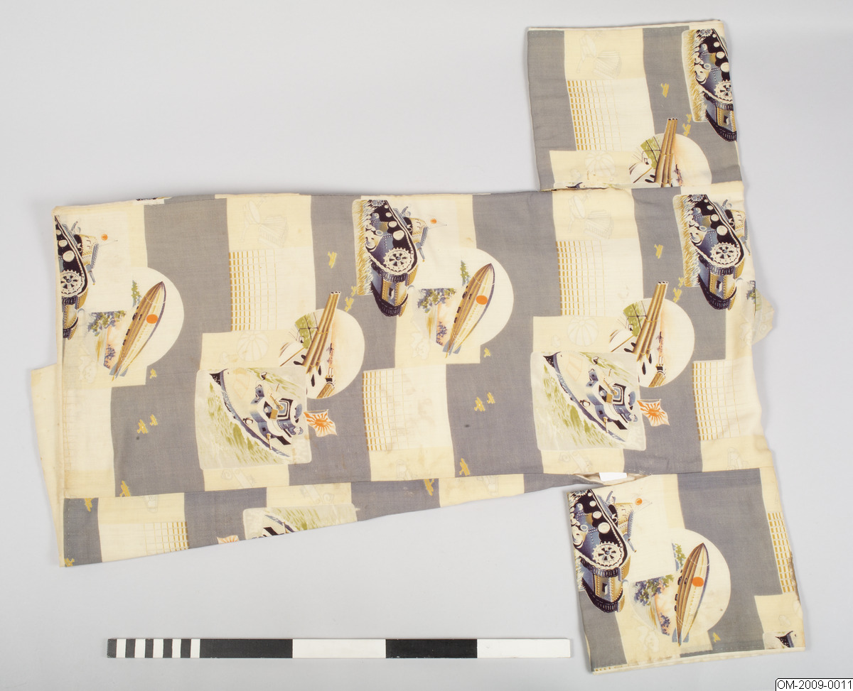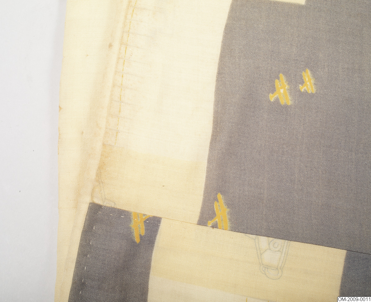 Pojk-kimono med krigsmotiv (propaganda) i form av bl a zeppelinare, krigsfartyg och tanks. Tuskaftsvävt ylletyg med tryckt mönster. 1930-40-tal.