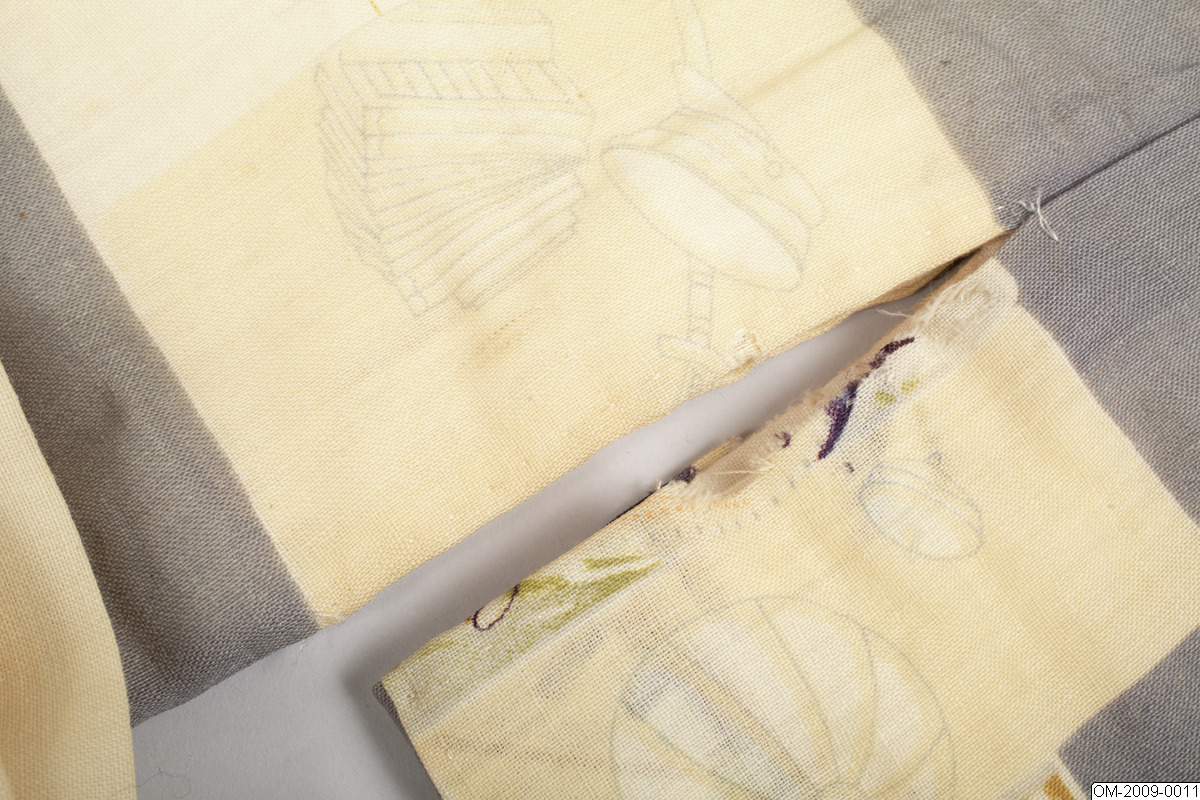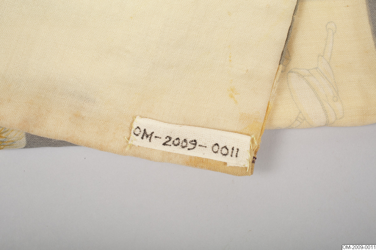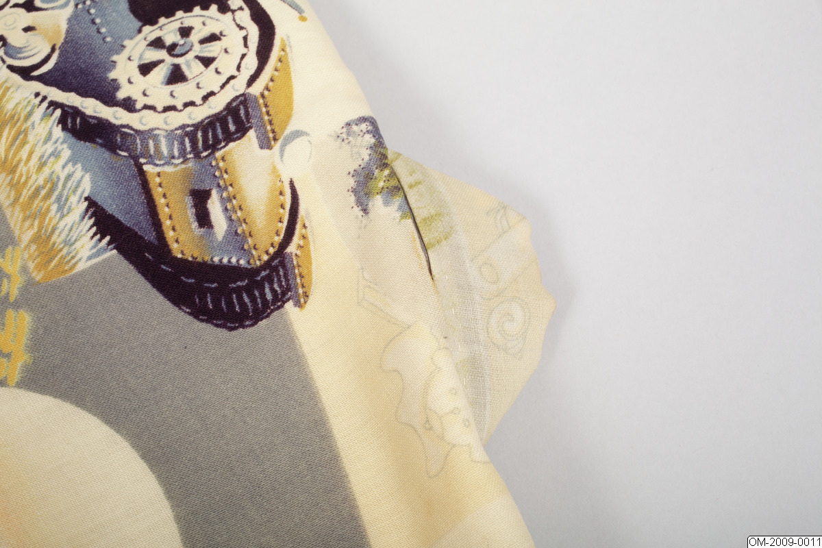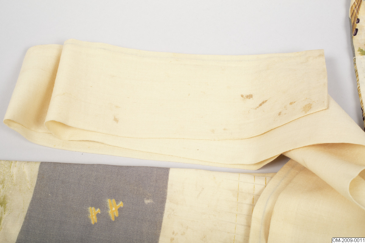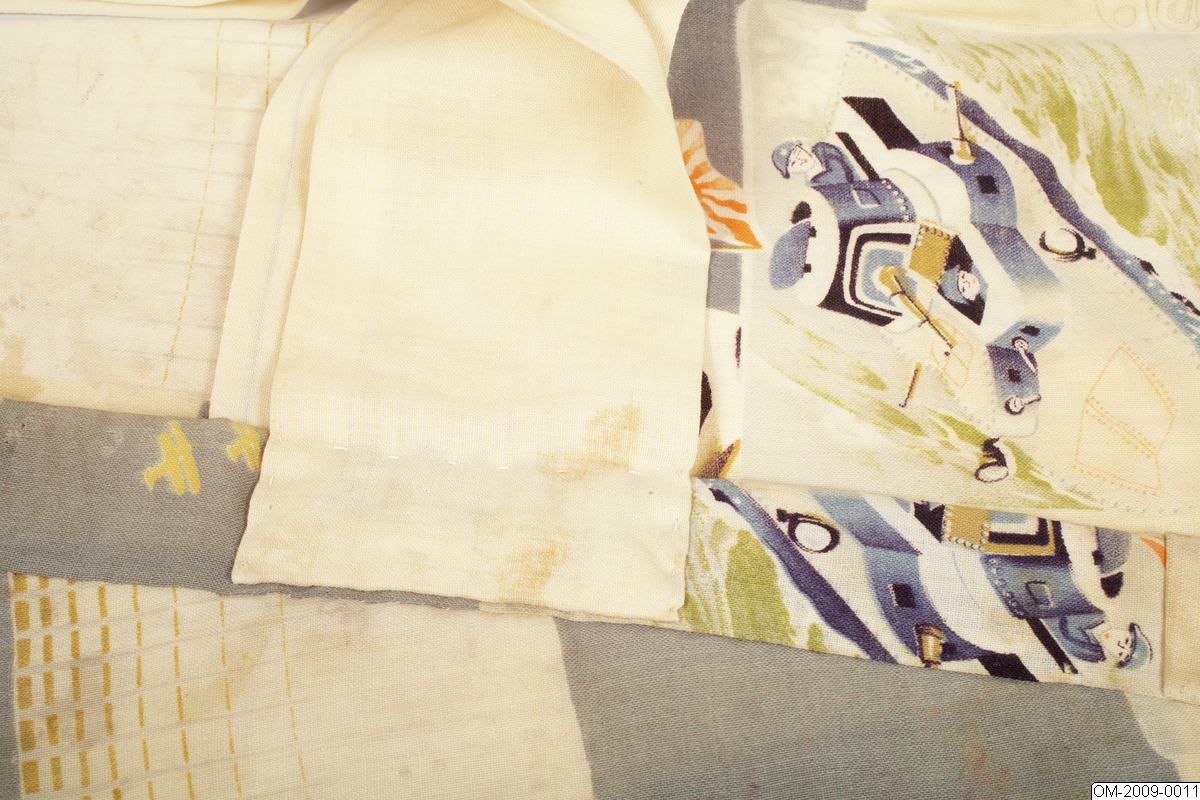 Pojk-kimono med krigsmotiv (propaganda) i form av bl a zeppelinare, krigsfartyg och tanks. Tuskaftsvävt ylletyg med tryckt mönster. 1930-40-tal.