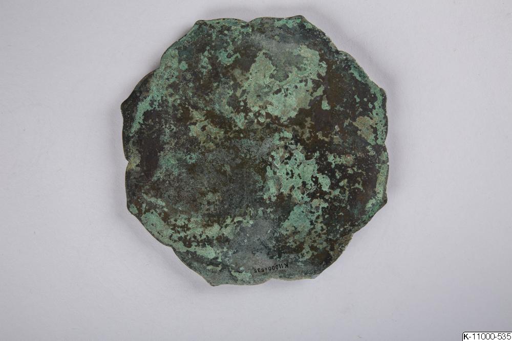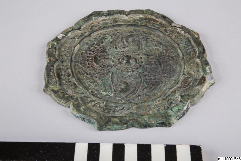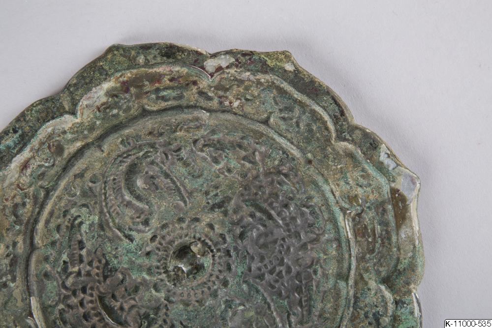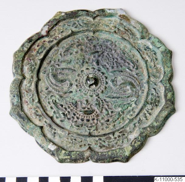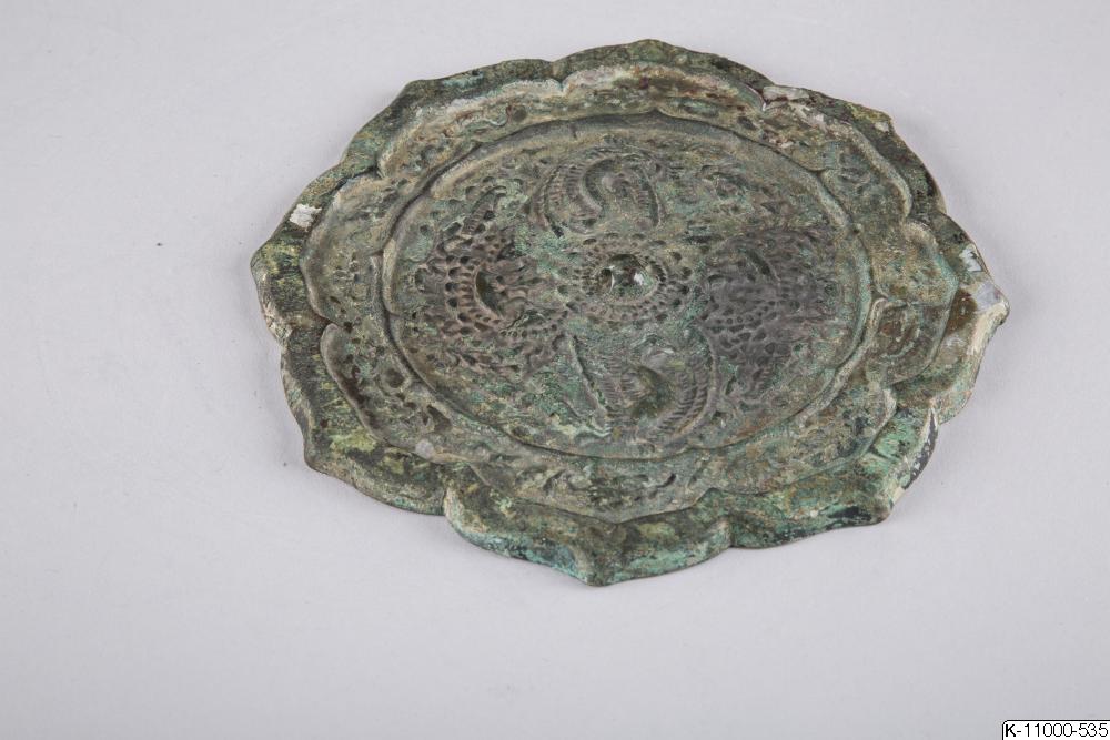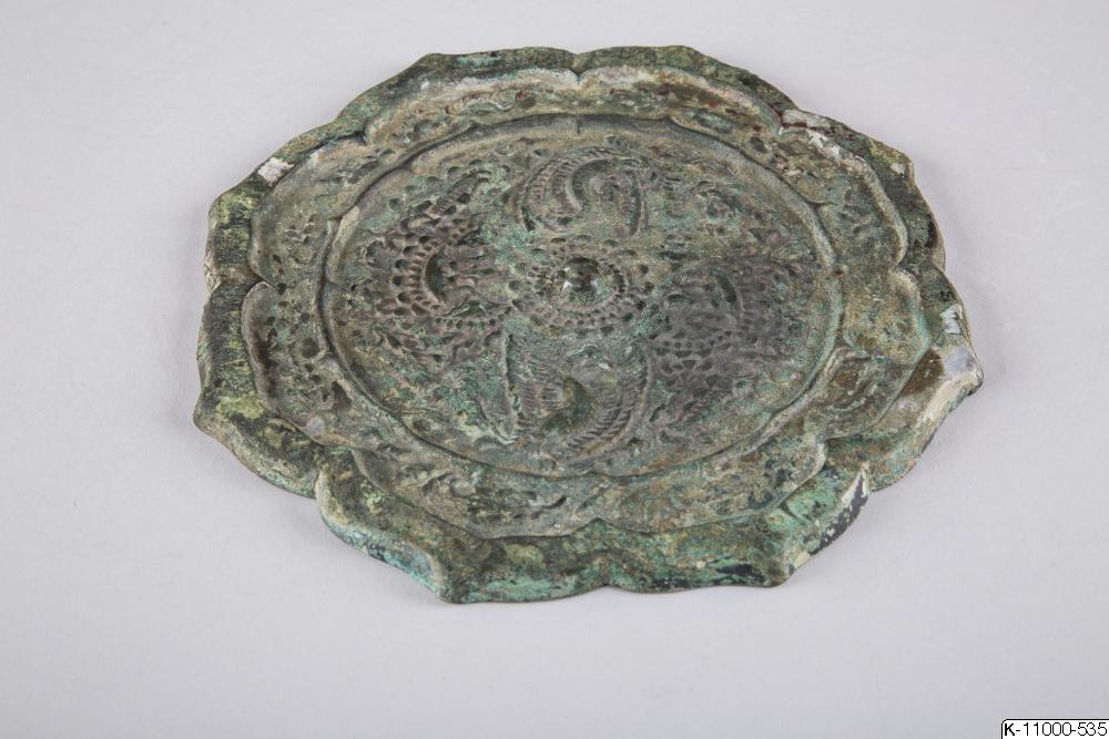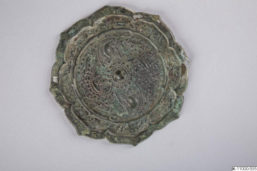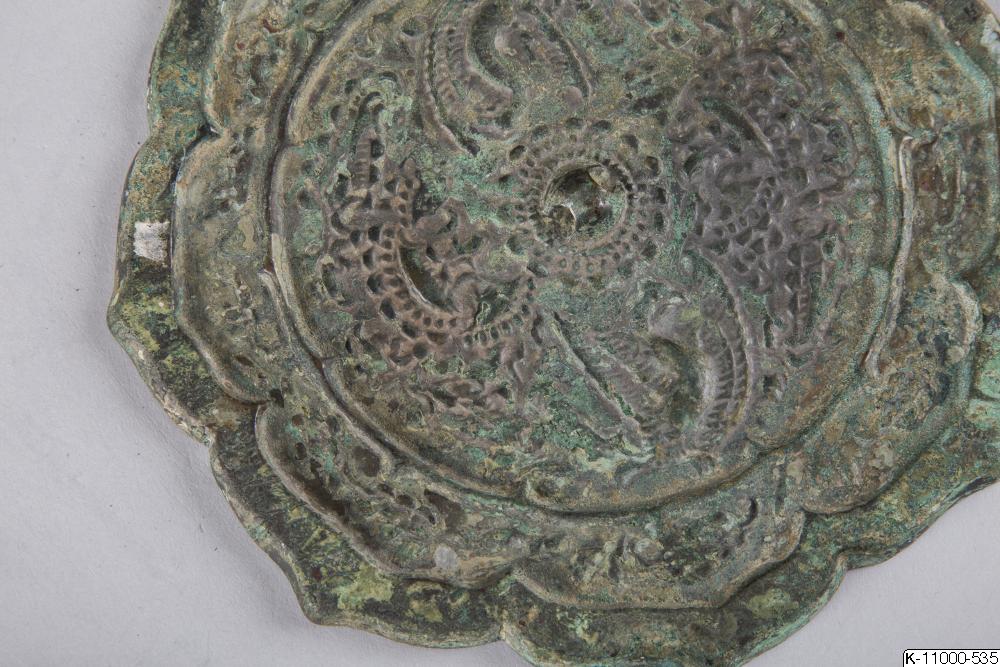 - Eight-lobed bronze mirror. Decoration in relief of two birds among ornaments.