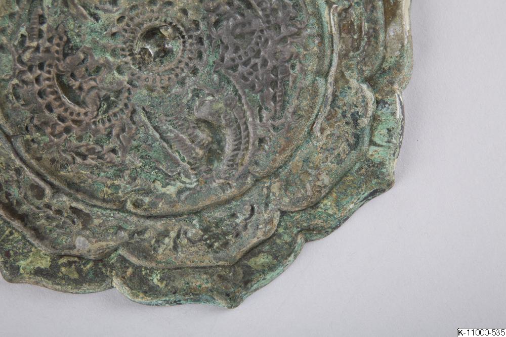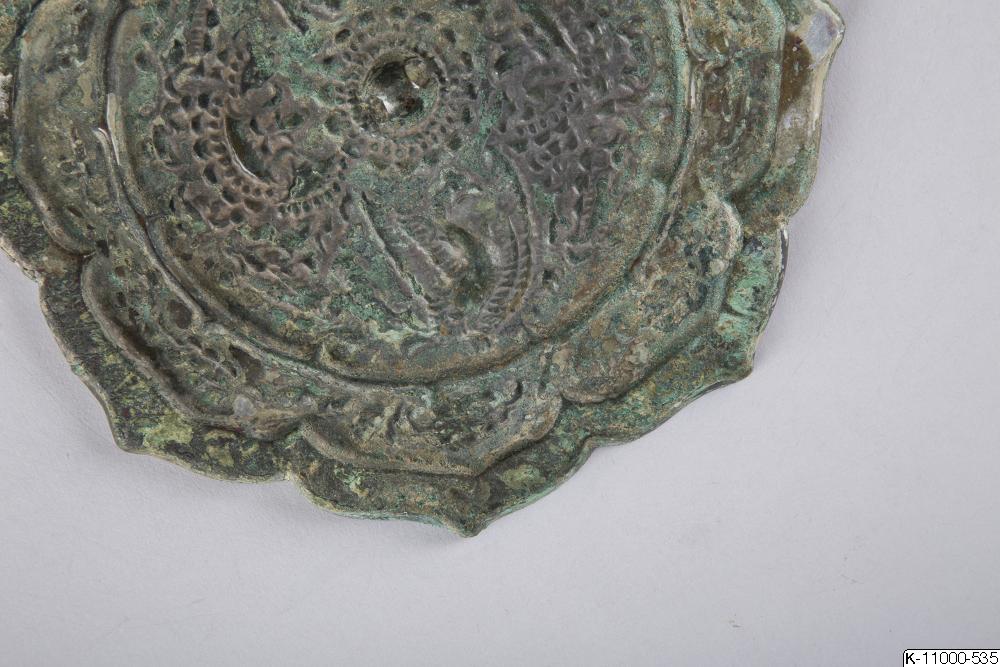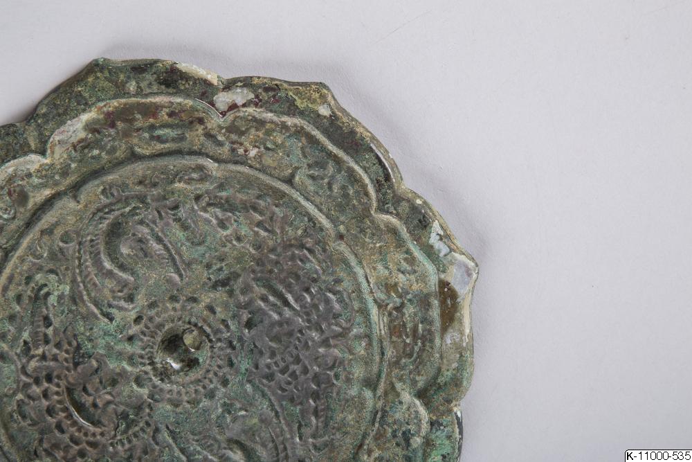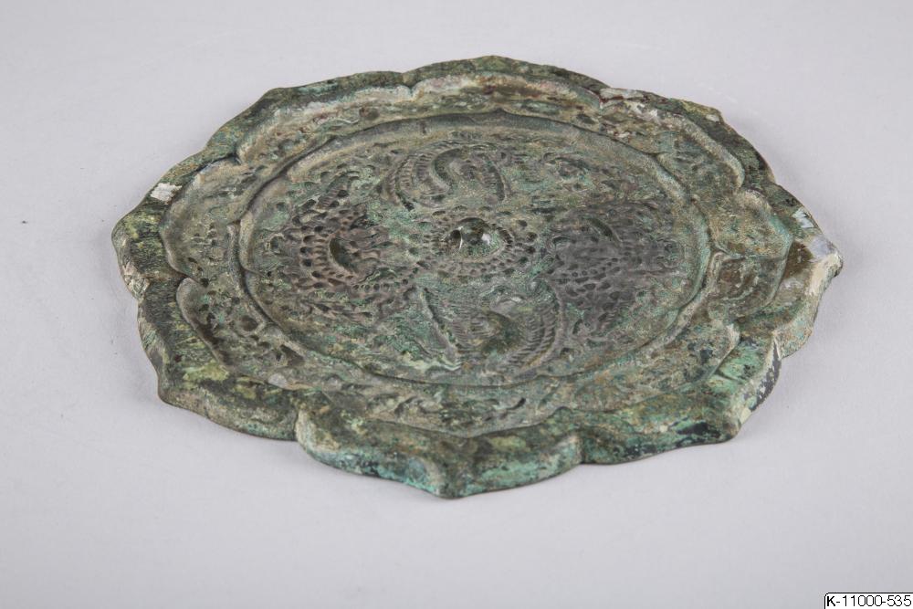 - The mirror's eight lobed shape, with each lobe coming to a point, reflects the Chinese influence on the shape and designs of Goryeo dynasty (918–1392) mirrors. In this case, the mirror is modelled after Tang dynasty (618–907) mirrors. On the back of the mirror, a central knob is encircled with a chrysanthemum pattern. The main motif consists of two juxtaposed birds with raised wings, possibly representing the mythical vermillion bird (Korean: Jujak), between lotus-like flowers and floral scrolls. An inner rim repeating the eight-lobed shape closes off the main motif from the outer registers filled with indistinct floral motifs. The knob has a hole which facilitated the tying of a tassel that was used to grip the mirror. The reflecting front surface of the mirror has now lost its clarity due to oxidation. Mirrors were widely used as requisite for daily toilette during the Goryeo period (918–1392).
