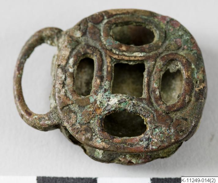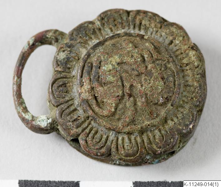 - Rembeslag försett med ögla. I kanten rundade uddar. På mitten en rund upphöjning dekoration med hjort och blomma. Röd- och grönfläckig patina.