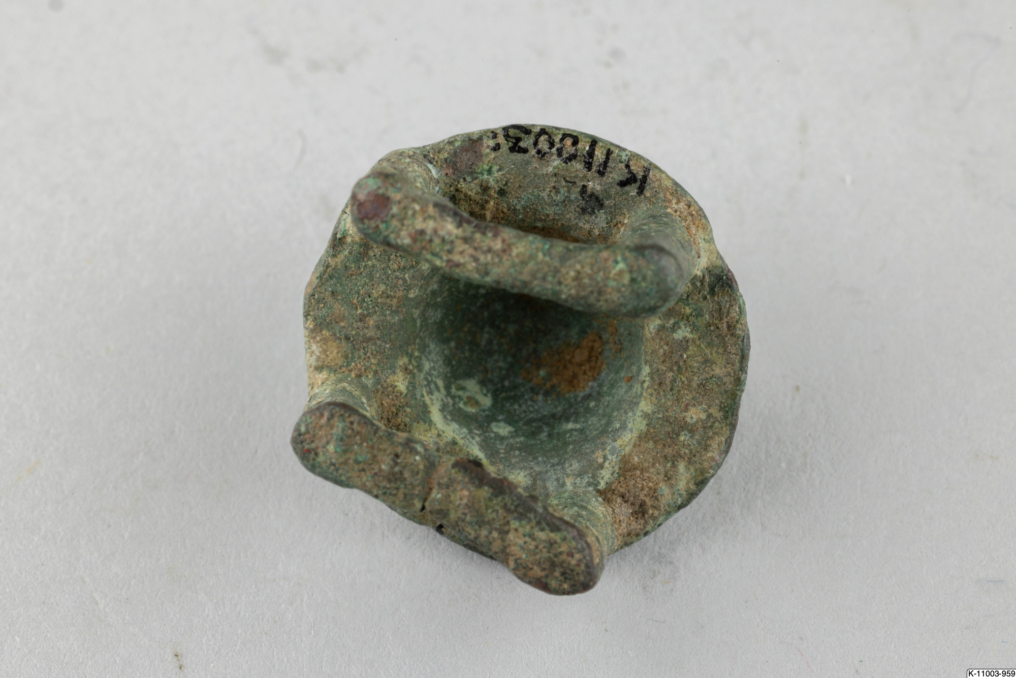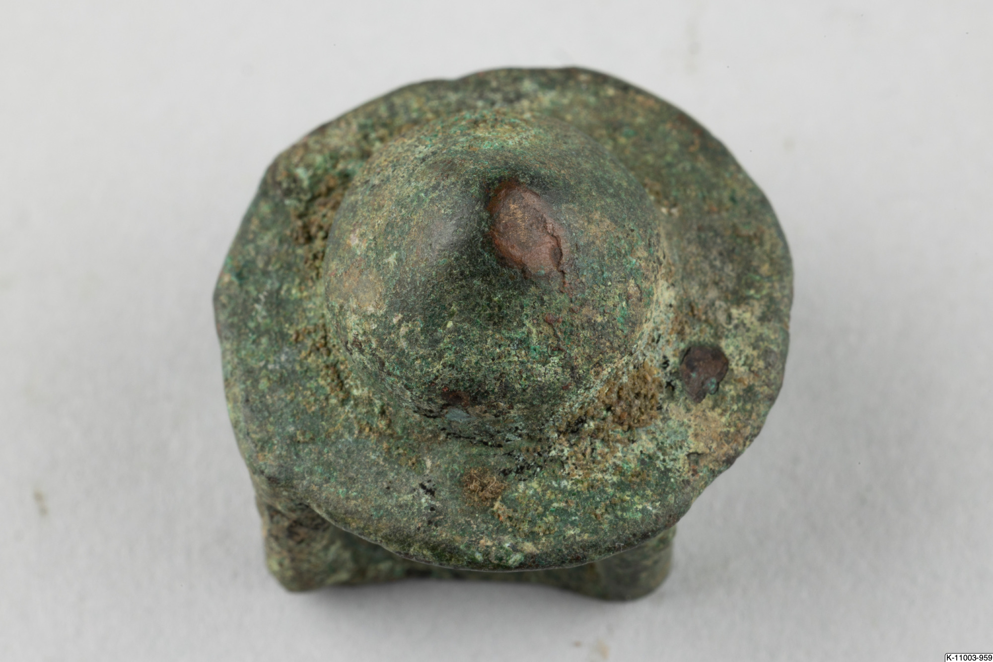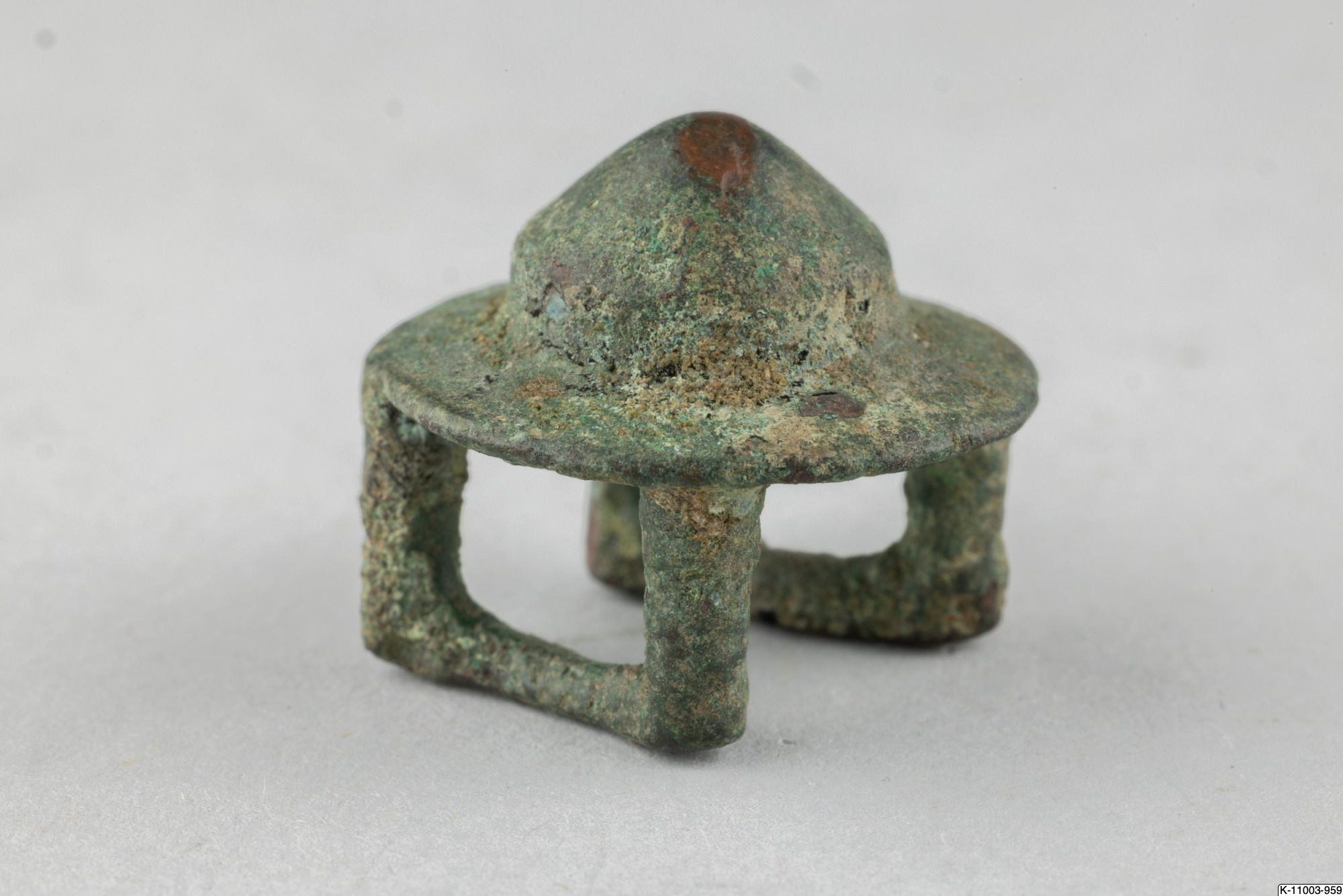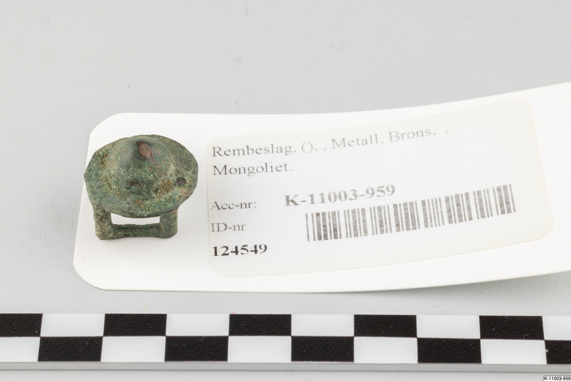 - Litet rembeslag i form av hattformig knapp med två stora rektangulära öglor på baksidan.