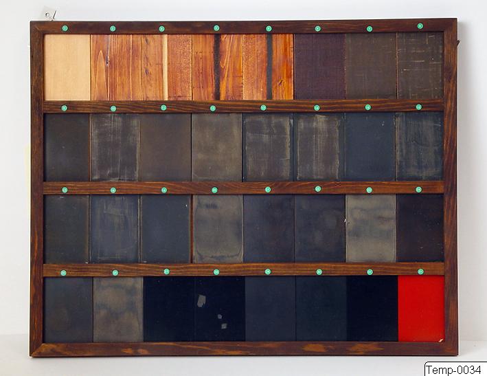 Lackprov/materialprov. Tavla av trä med prover på olika stadier av lacktillverkning, från nummer 1 till 31. Från Japan. Tavlan visar hur lacken förändras då lagren blir fler och fler. På plattornas baksida finns handskriven information om lacken, här dold av förspikade masonitskivor. Hör ihop med TEMP 0035. Sannolikt tillverkad av Mutsumi Suzuki (1942-2009).