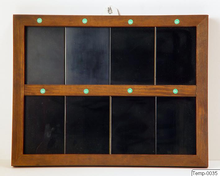 Tavla av trä med lackprover dvs på olika stadier av lacktillverkning, från nummer 32 till 39. Från Japan. Tavlan visar hur lacken förändras då lagren blir fler och fler. På plattornas baksida finns handskriven information om lacken. Hör ihop med TEMP 0034. Sannolikt tillverkad av Mutsumi Suzuki (1942-2009).
