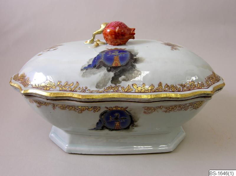 Servis av porslin (Inventarienummer: BS-1646) bestående av åttkantig terrin m granatäpple på locket och handtag i form av vildsvinshuvuden på kortsidorna; ovalt fat, snäckformade saltkar; tallrikar; tekoppar m fat; kaffekoppar m fat; chokladkoppar med öra.