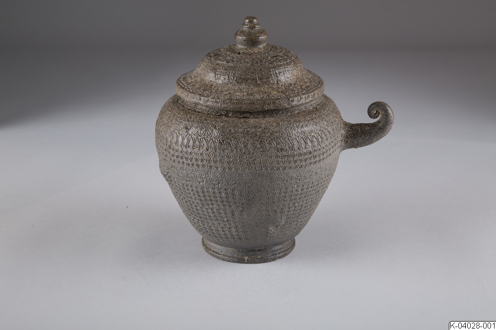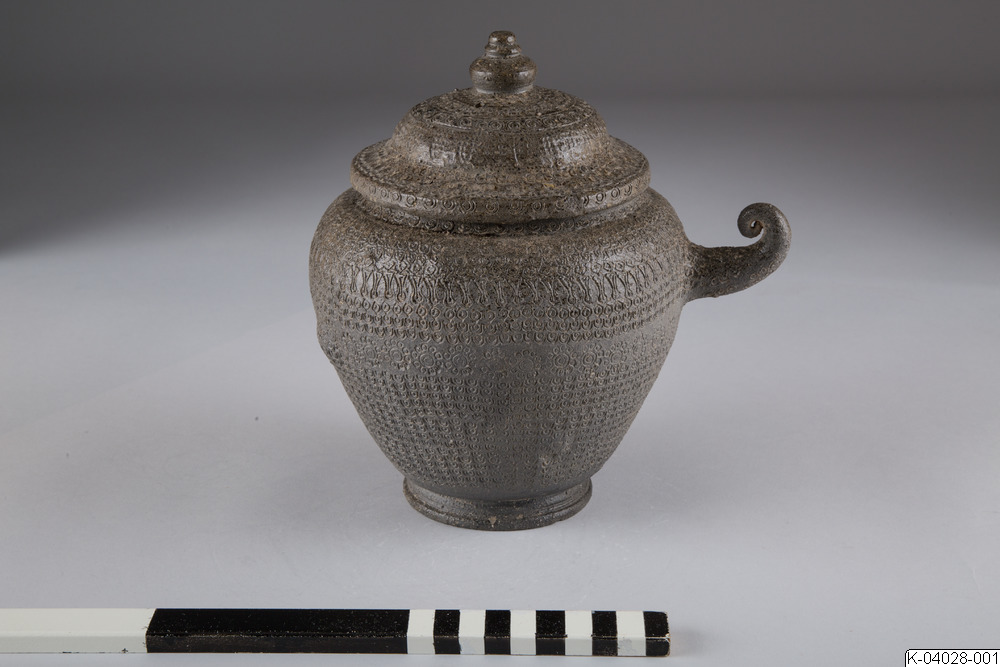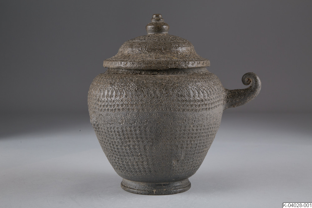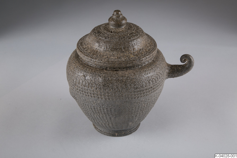 Begravningsurna med lock och spiralformat handtag. Täckt med instämplad dekor. Stengods, delvis försedd med naturlig askglasyr.