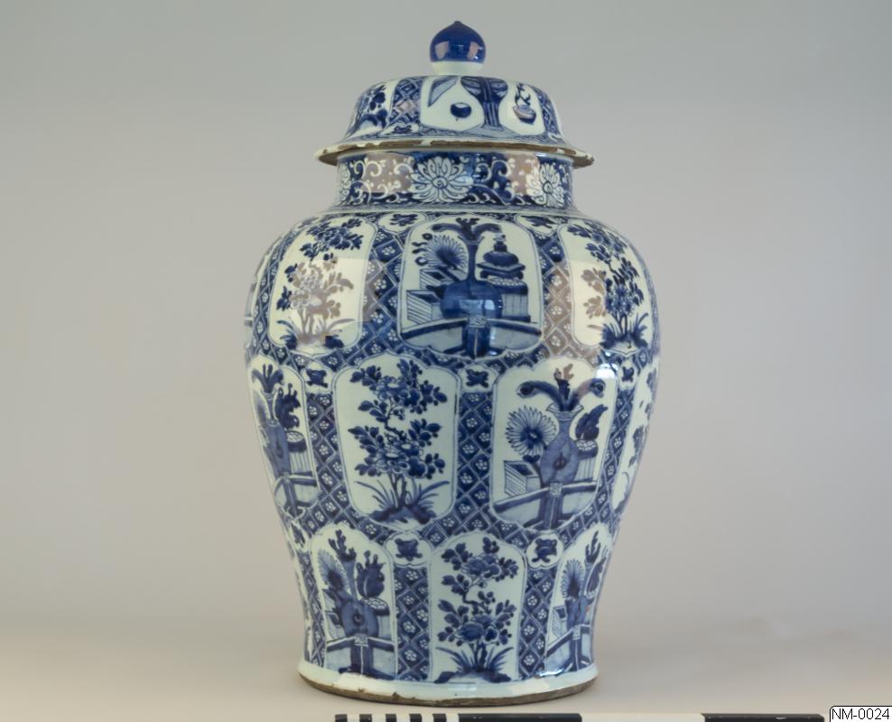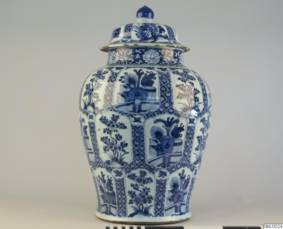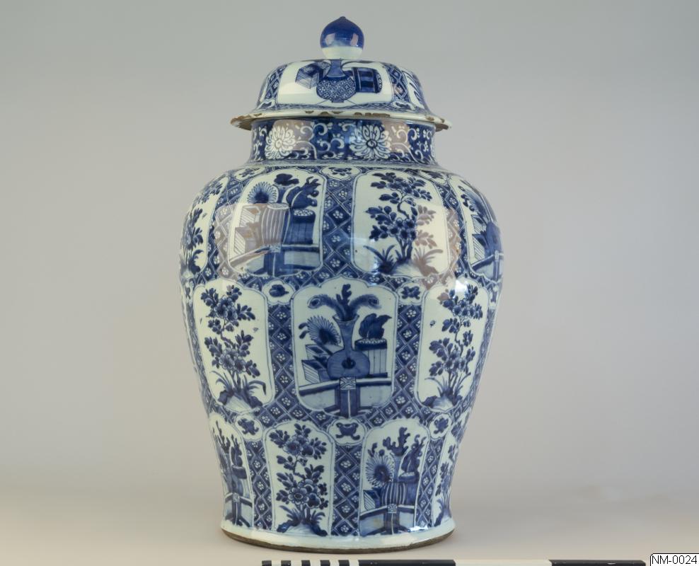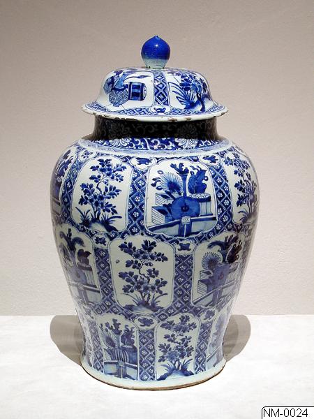 - Vas (jfr NM-0023) av orientaliskt porslin, med dekoration i blått- och vitt. ... är vidast upptill, avsmalnar något neråt starkt intryckt upptill till en kort hals och med överskjutande underkant och en klotformig kropp (till övre hälften, till den nedre vit). Över hela vasen (med undantag av halsen som är dekorerad med ett ornament) är utbrett ett nät av mångsidiga fält på en botten av linjeornament. Dessa fält, å buken rader med 8 i varje, innehålla ... med blommor, solfjäder, böcker mm. Höjd 0,47 (Nationalmuseums katalog)