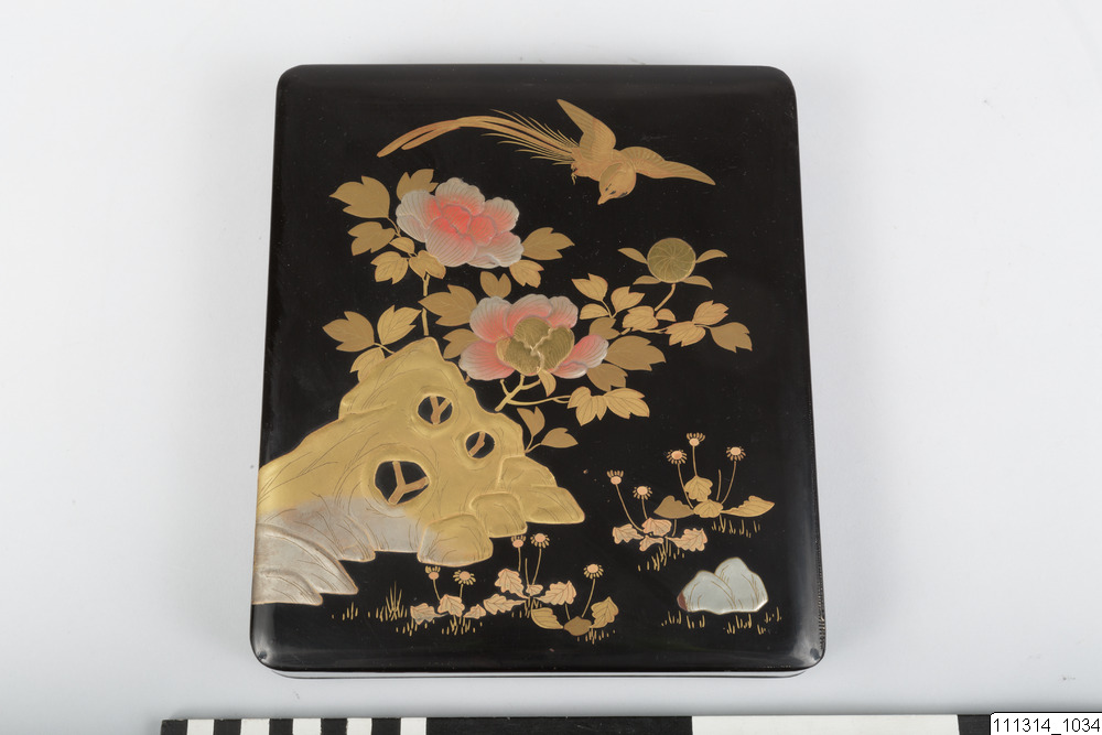 Ask med lock. Rikt dekorativt lackarbete i guld och färg med pionblommor och en frågel mot svart bakgrund.
