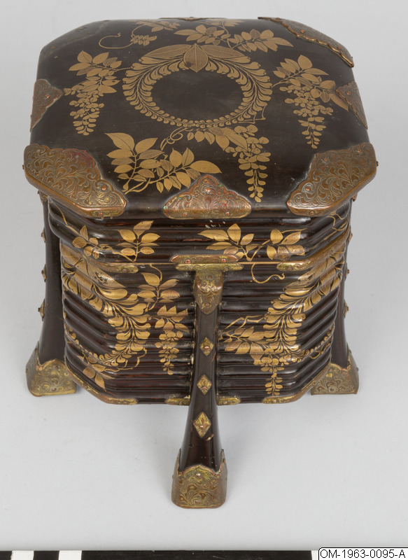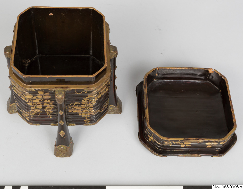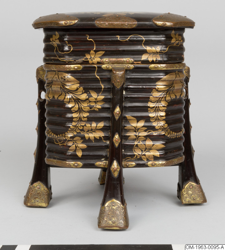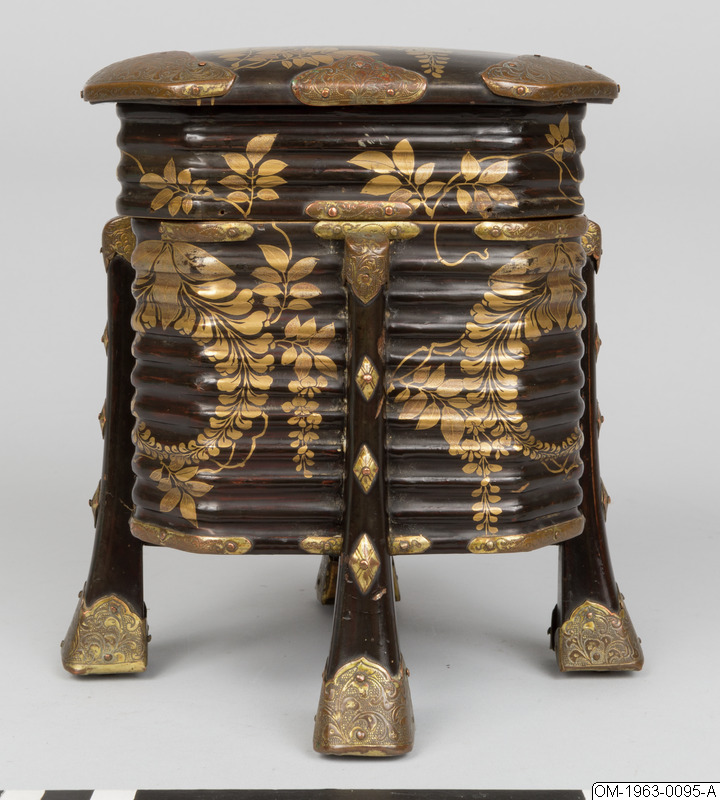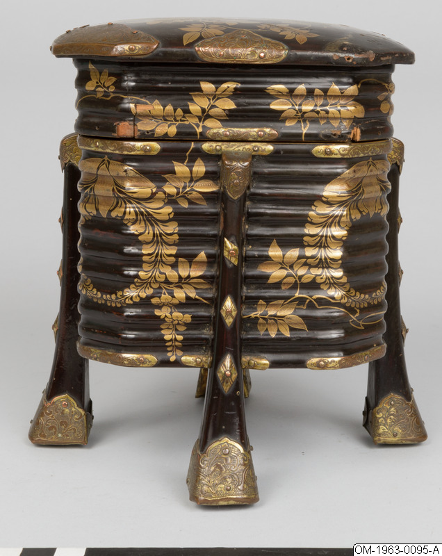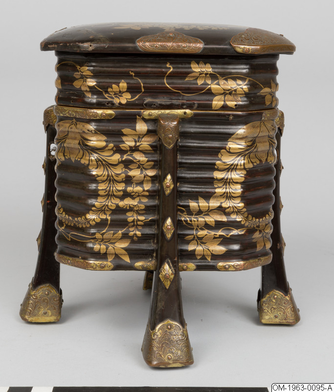 Ask med lock av lackerat trä, från Japan. Asken står på fyra ben, har horisontellt räfflade svartlackerade sidor dekorerade i guld med blommor. Asken har metallbeslag. Inuti asken förvaras en lapp med påskriften “Wisteria design, 18th century”. Asken är ett par tillsammans med ÖM 1963:094.