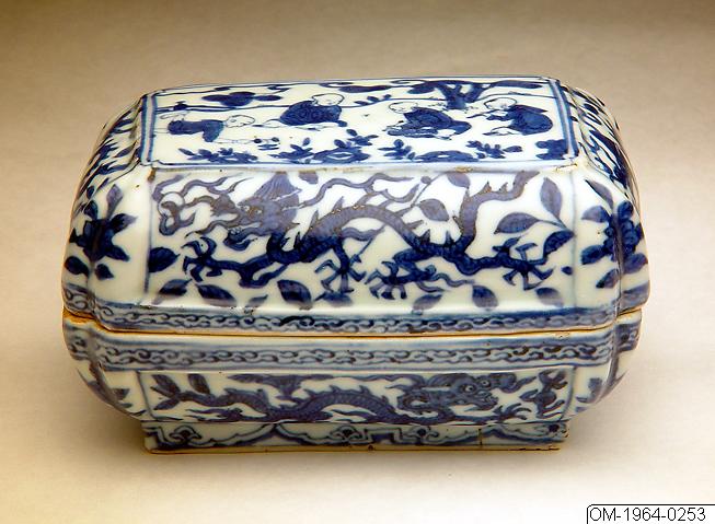 Dekor i underglasyrblått. På locket dekor med spelande barn i landskap. På sidorna fält med femkloade drakar förföljande den heliga juvelen bland blomrankor. Blomkvistar i hörnen och bård av moln vid kanten. Ruyi-ranka på foten.