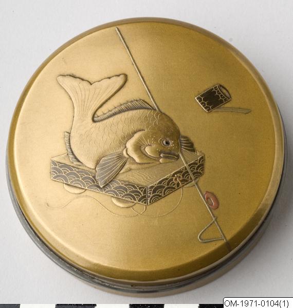 Rund dosa av guldlack med dekor av fisk, med tillhörande textilfodral (shifuku). 1800-tal.