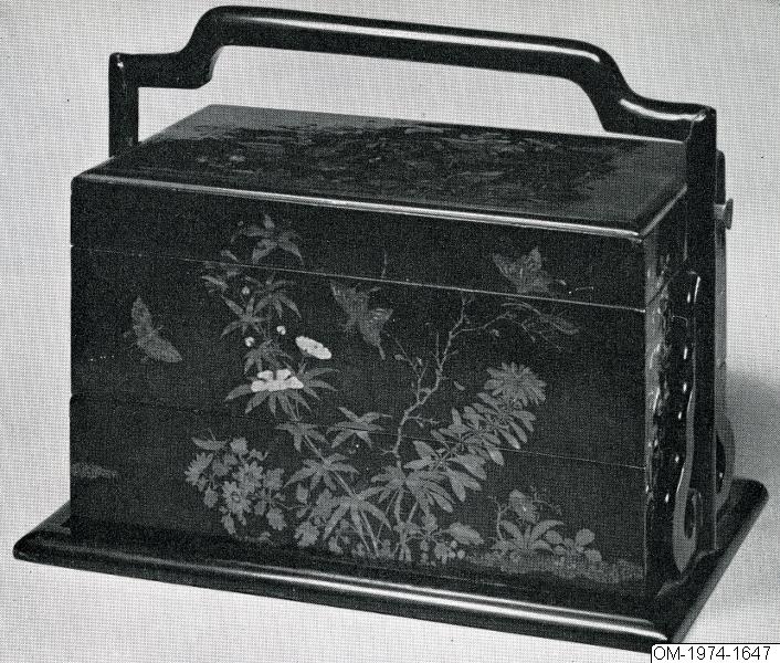 Enligt katalogkort: “Chinese lacquer picnic set. Period: Ch’ing, Ch’ien-lung. Description: Rectangular, of three boxes with straight sides, hold together by frame serving as handle. Black lacquer, decorated with laque burgautée and p’ing t’o. Inlaid with flowers and insects. Measures: L. 243mm W. 150mm H. (with handle) 193mm. Purchased: Bequest of H.M. King Gustaf VI Adolf. No 2414. Dossier: B. Gyllensvärd: BMFEA 44/1972, Pl. 17. Expo: Stockholm 1967, No 175. London 1972, No 167. Denmark 1975, No 158.”