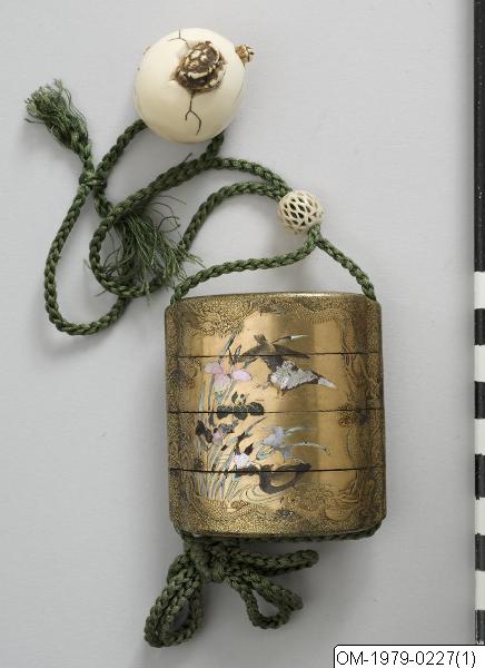 Fyrdelad inro i guldlack med pärlemorinläggningar. På fram- och baksidan en reliefbård i lack föreställande drakar. Pärlemormönster på framsidan visande änder och iris, på baksidan shi-shi (lejonhund) och pion. 1800-tal. Netsuke i form av lejon.