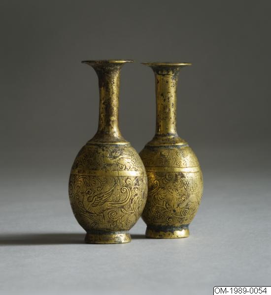 Två flaskformade miniatyrvaser av förgylld brons. Låg fot, ovoid kropp, hög hals och utvikt mynning. Kroppen med ciselerad dekor i två band av fåglar och djur mellan vinrankor mot fond av stansat ringmönster.