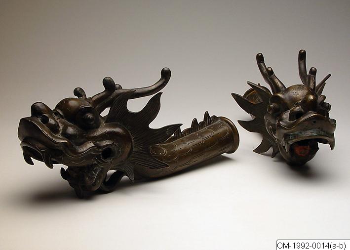 - Ett par vattenkastare av brons i form av drakhuvuden. Med inristade detaljer. Med spår av röd bemålning.