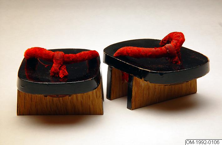 Ett par skor, geta, för barn av svartlackerat trä. Undersidan olackerad. Tårem av röd sammet (birodo).