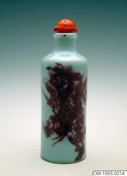 - Snusflaska eller medicinflaska av porslin med dekor i underglasyrrött. Dekoren visar demonutdrivaren Zhong Kui omgiven av fladdermöss