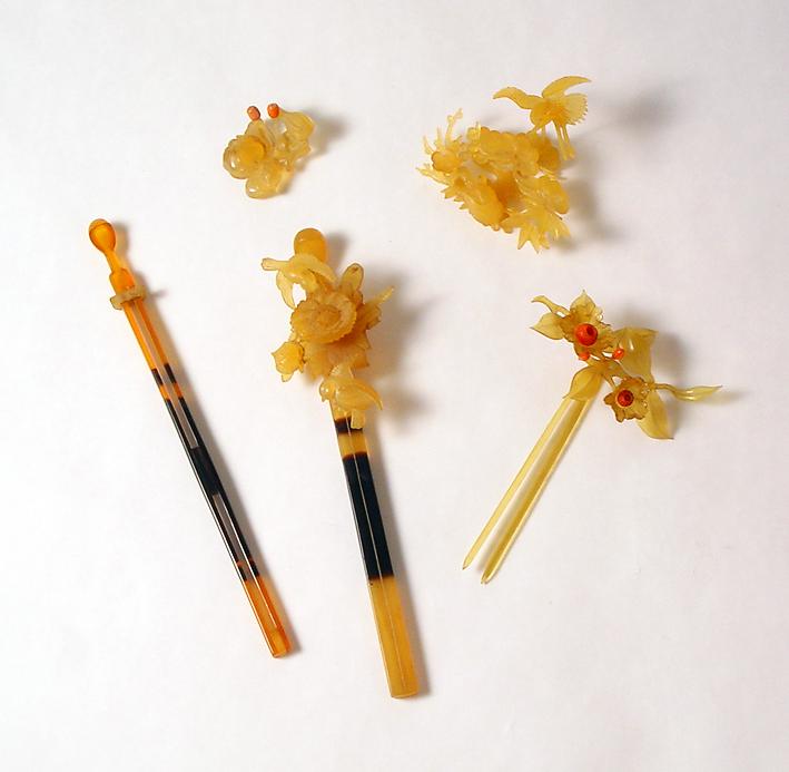 - Set med 5 stycken olika hårprydnader, vissa dekorerade med korall. Materialet obestämbart, möjligen sköldpadd, hornmaterial eller plast. Tillsammans med föremålen förvaras en lapp med påskriften “Div. okat. föremål fr. Flottans förråd, hårnålar etc.”