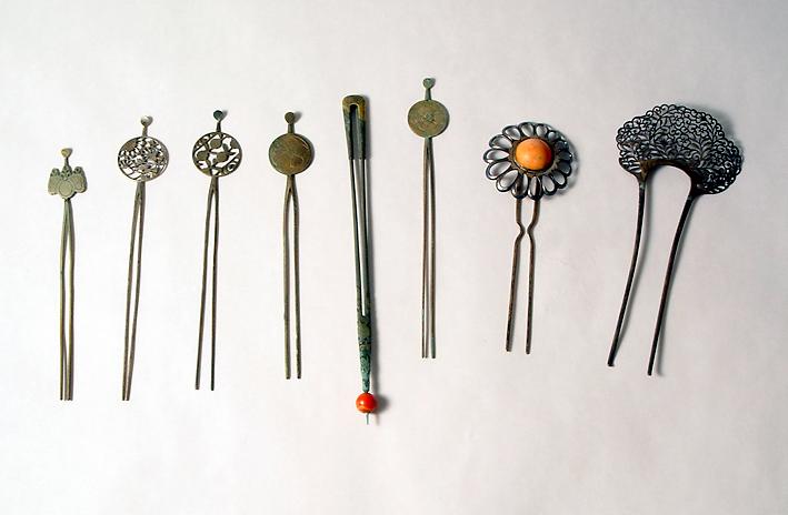 - Set med åtta olika hårprydnader av metall, ett par med korall. Tillsammans med föremålen förvaras en lapp med påskriften “Div. okat. föremål fr. Flottans förråd, hårnålar etc.”