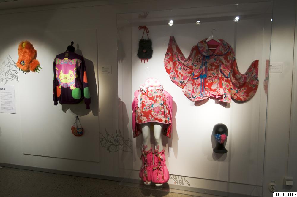 I utställningen visas utsökta vintage kimonor och textilier där materialen och teknikerna briljerar, blandat med spektakulära kreationer av några av Japans hetaste unga designers och konstnärer. Från Takyua Angels spektakulära kreationer till streetsmarta barnsligheter från Shojono Tomo. Handgjorda accessoarer för unga Geishor samsas med graffitikonstnären Shin Tanakas väggmålningar och hip-hopiga origami-figurer med mönster inspirerade av gamla kimonos.