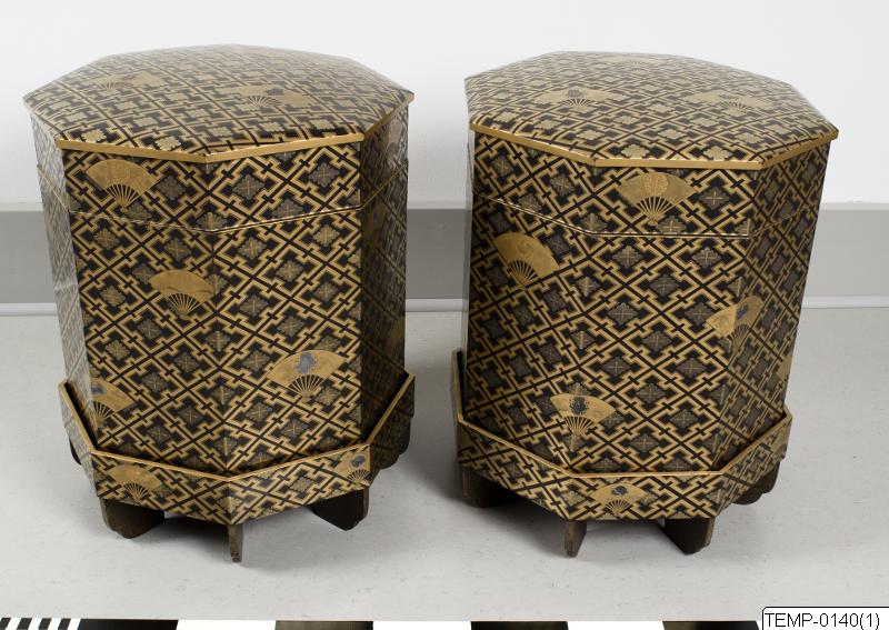 En av två stycken stora askar av lackerat trä, från Japan. Askarna är åttkantiga, svartlackerade och har dekor i guldlack av solfjädrar mot bakgrund med geometriska mönster med blommor. Varje ask består av tre delar; lock, ask samt ställ. Askarnas insida är klädd med textil. Stället är dekorerat med nashiji-bakgrund samt körsbär och tallskott i guldlack. Inuti en av askarna fanns vid tillfället för registrering en lapp med påskriften “18th c.” varför man kan anta att askarna är från 1700-talet.