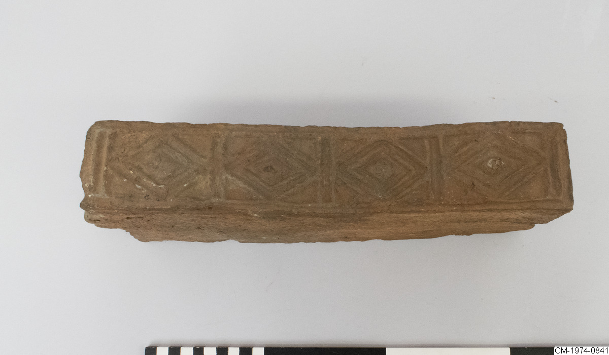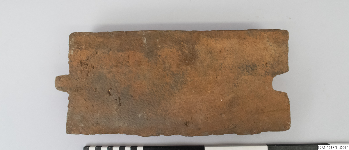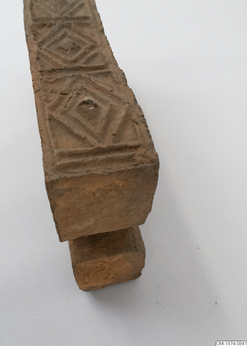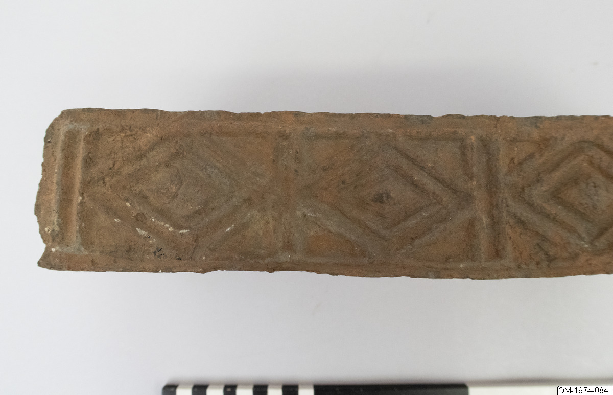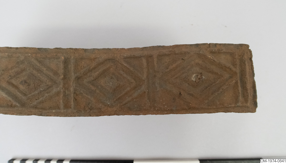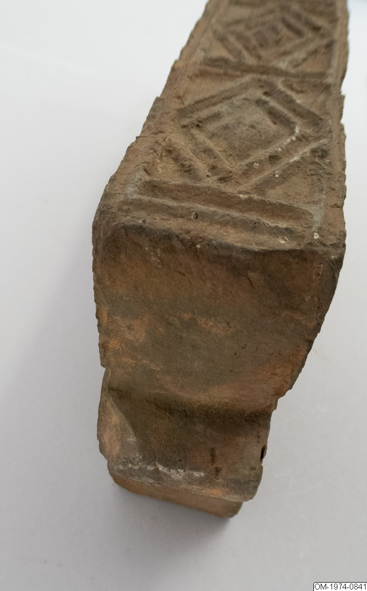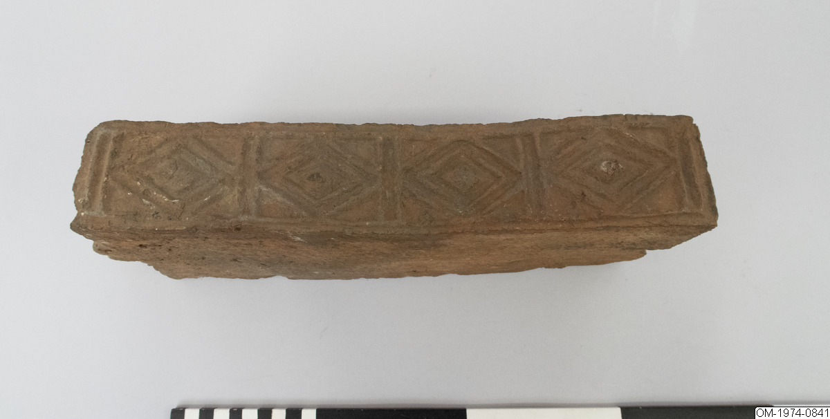 Enligt katalogkort: Rektangulärt tegel med tapp på ena, och halvrund urtagning på andra kortsidan. geometrisk dekor i relief på ena kanten.