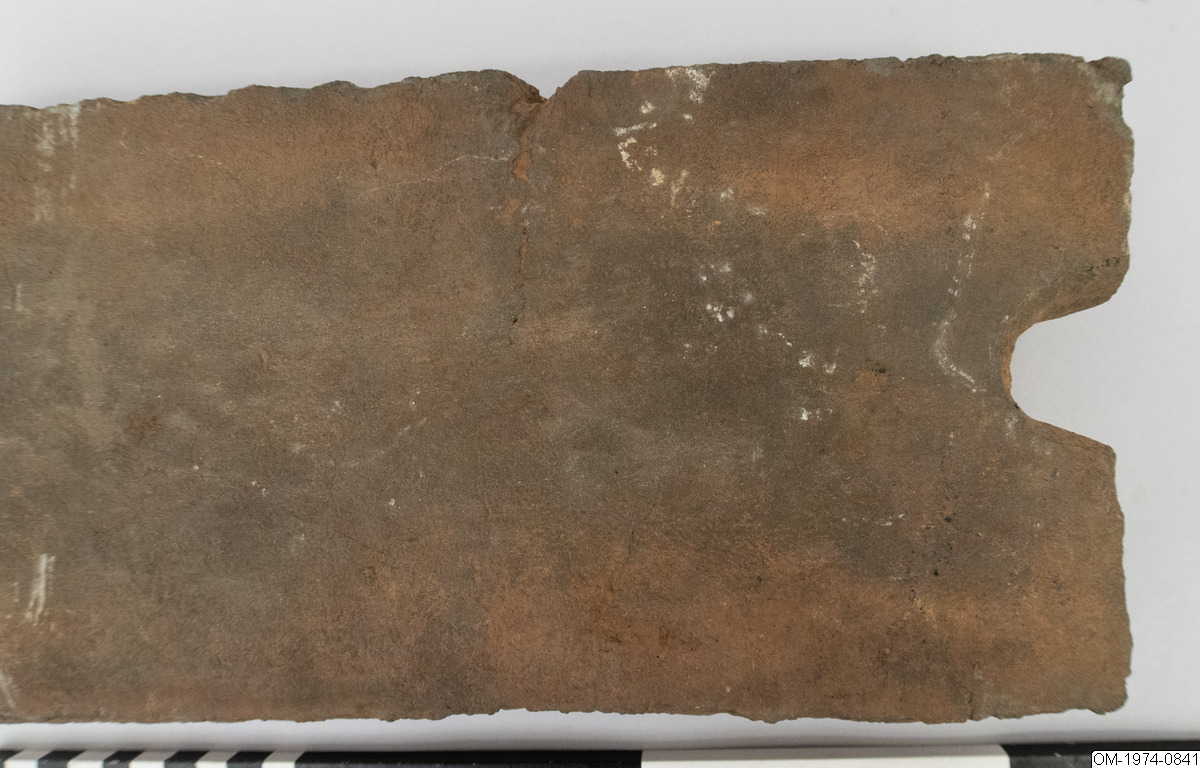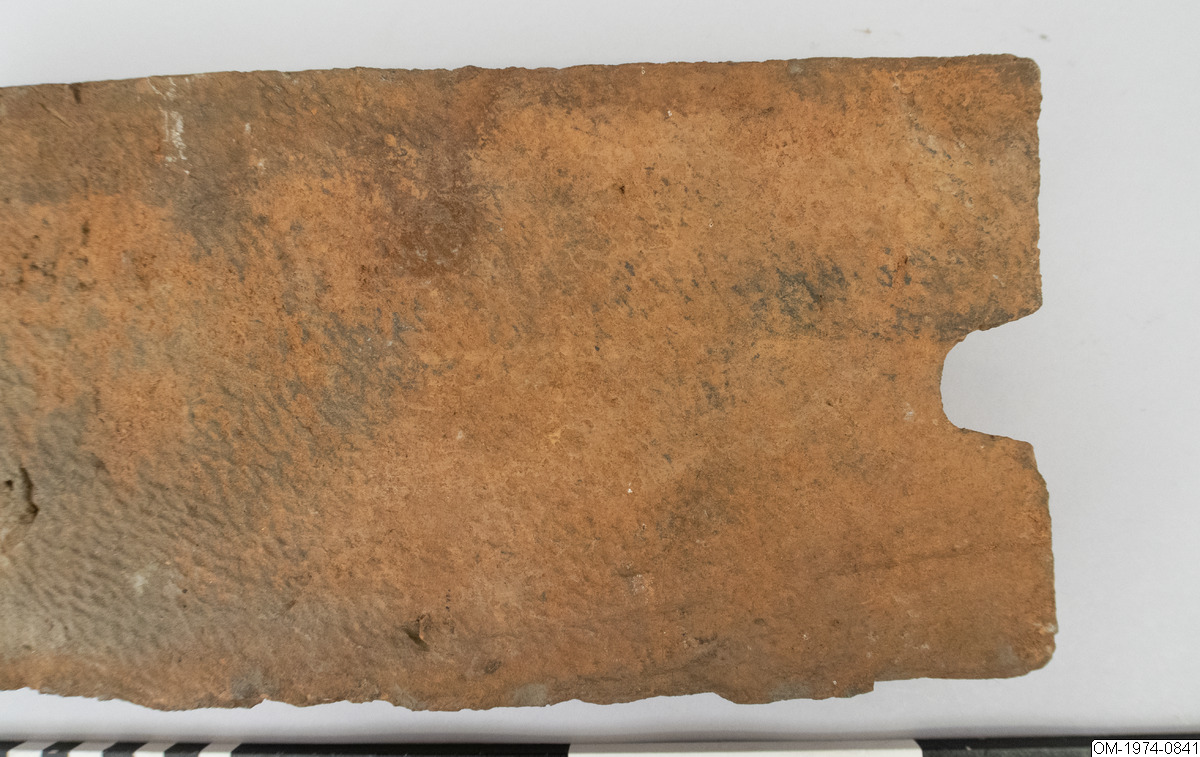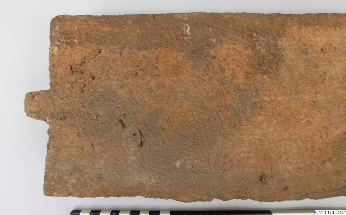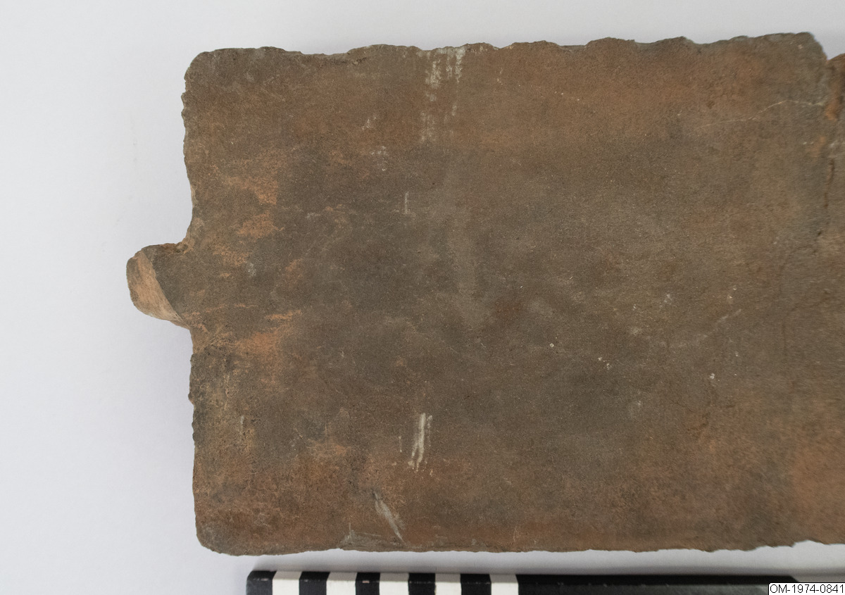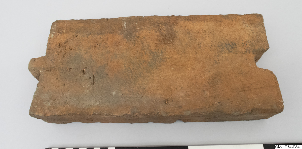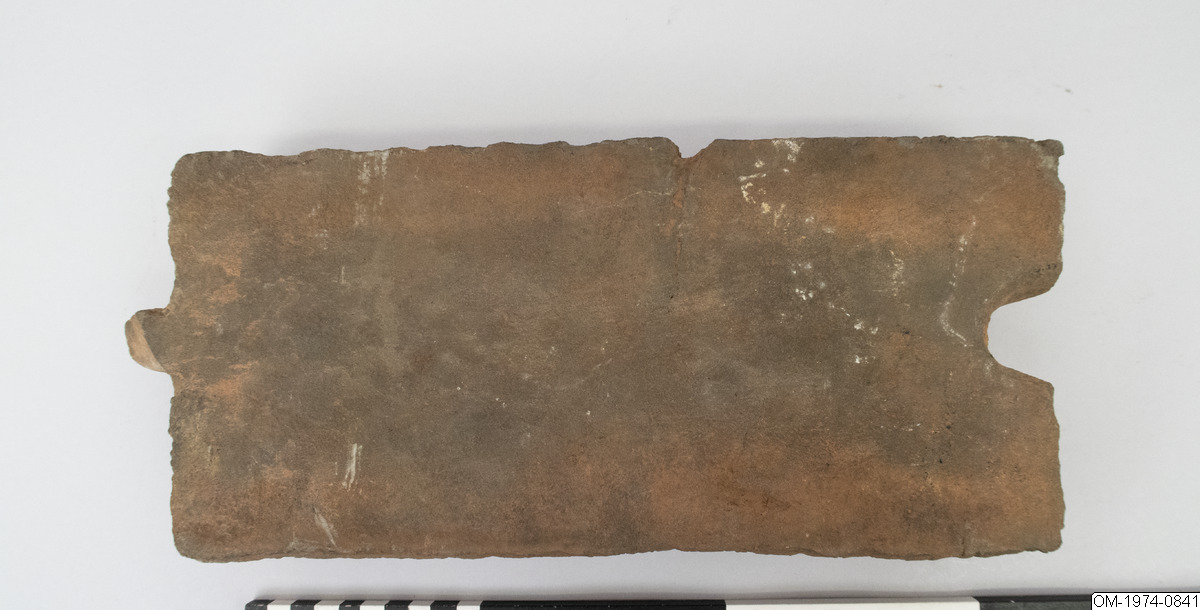 Enligt katalogkort: Rektangulärt tegel med tapp på ena, och halvrund urtagning på andra kortsidan. geometrisk dekor i relief på ena kanten.