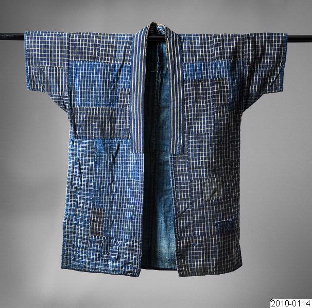 Fordad jacka (noragi) för lantbrukare eller annan del av Japans fattigare skikt, av bomull i tuskaft, indigofärgad. Främst rutiga tyger har sytts ihop med stygn för att bilda en kort jacka. Sannolikt första decennierna på 1900-talet.