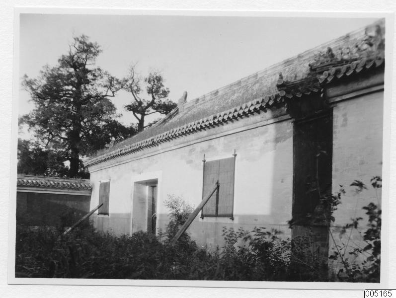 - En igenbommad byggnad med vitkalkade väggar och högt ogräs utanför.