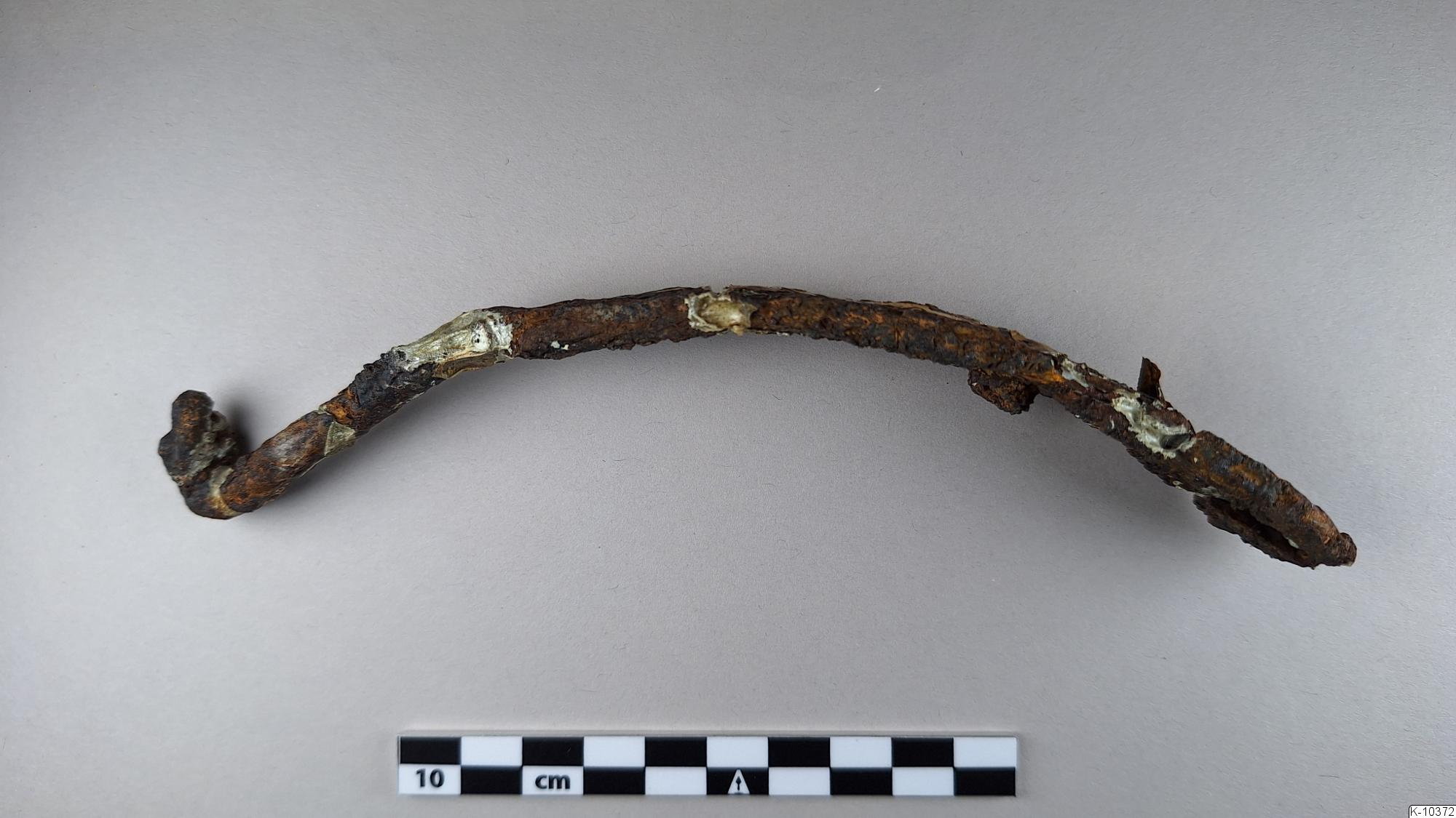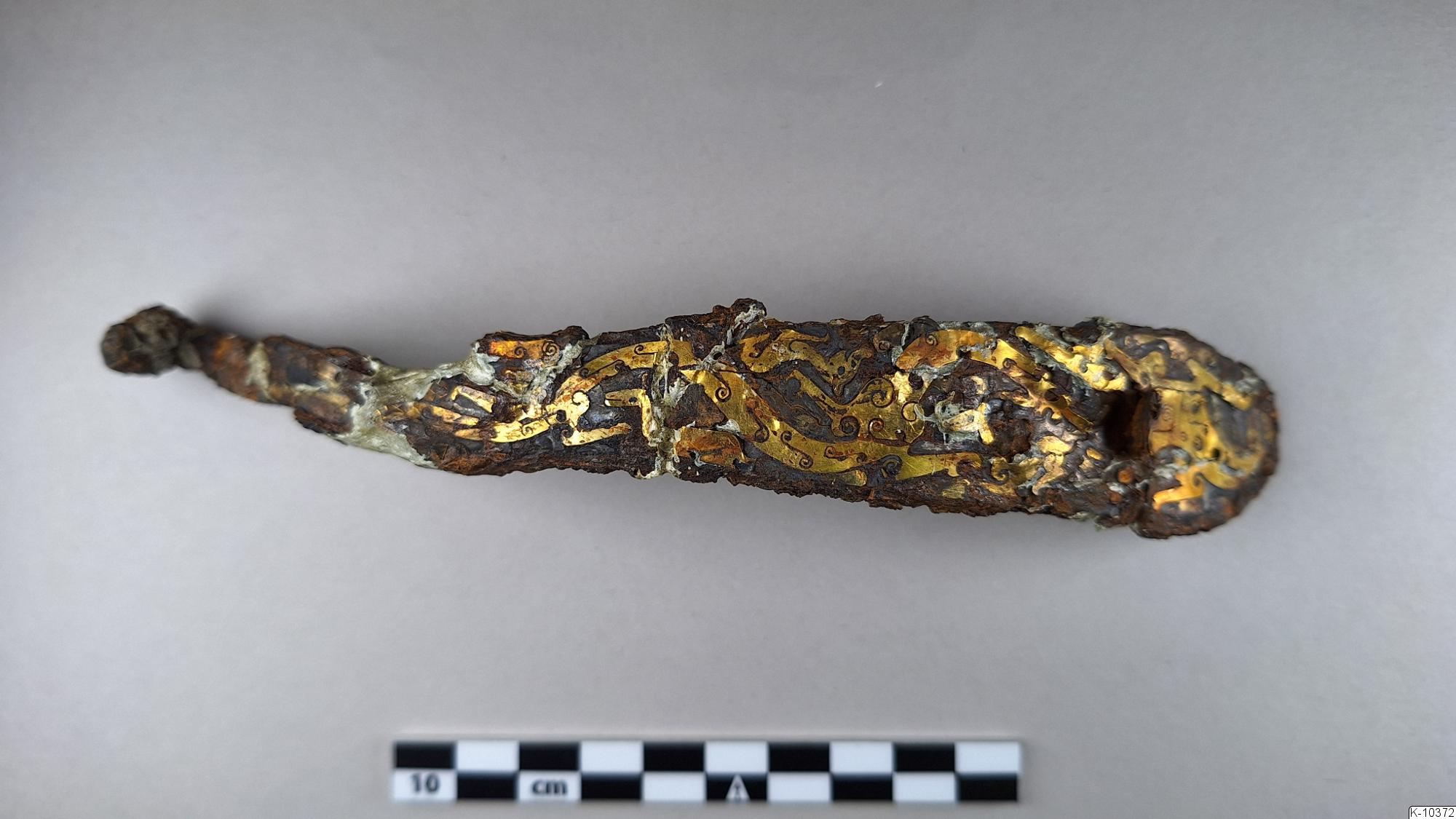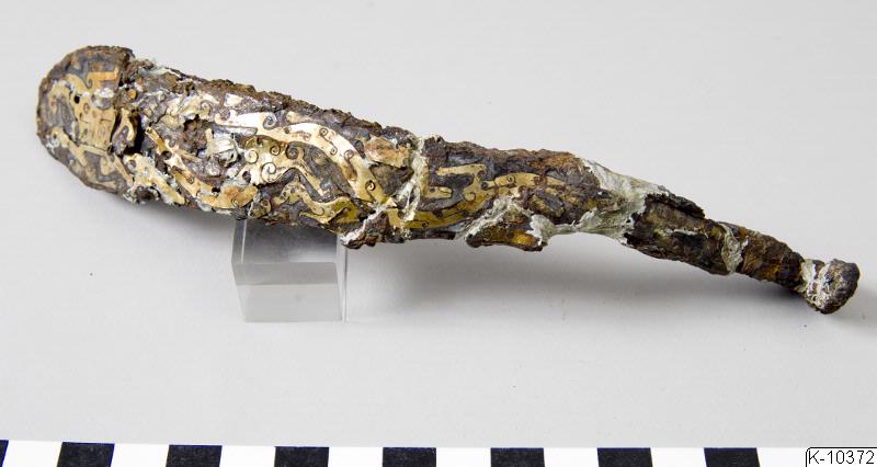 - Dräkthake av järn med guld och silverinläggningar. Dekoration i form av drake, tre smådjur och en örn.