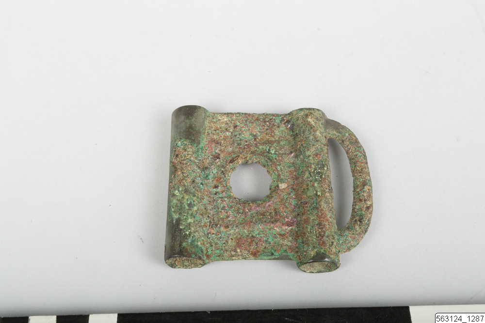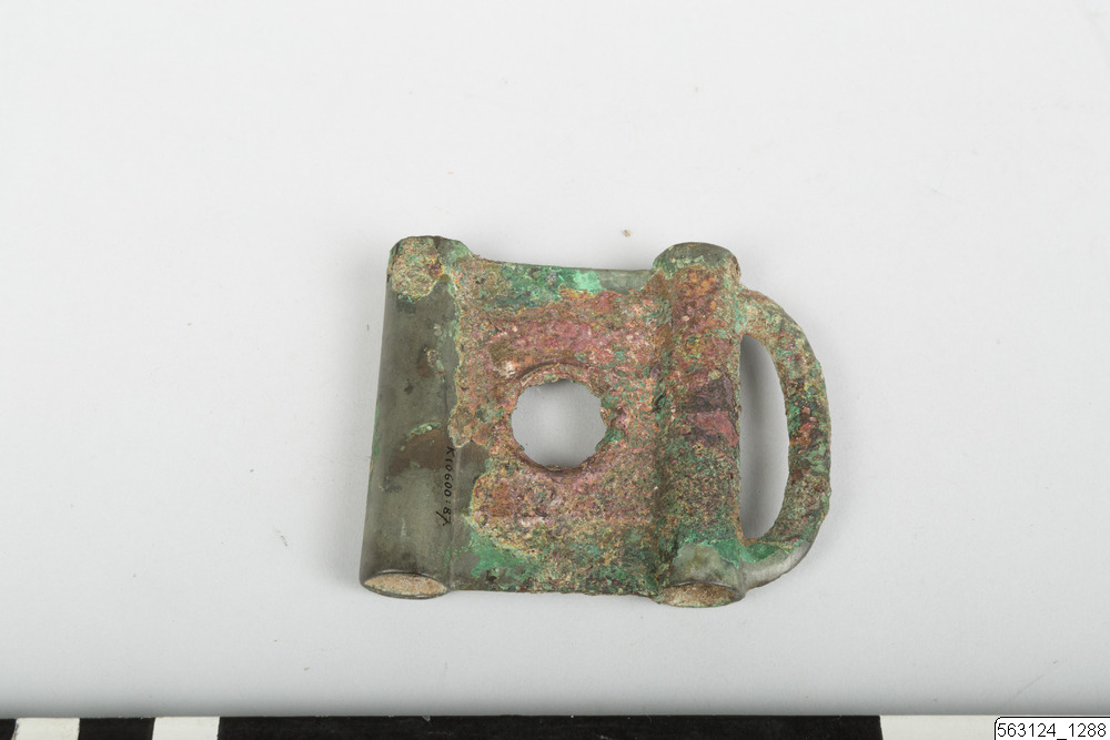 - Beslag till hästmundering.Rektangulärt. Upptill och nedtill ett ihåligt rör. Hål på mitten.