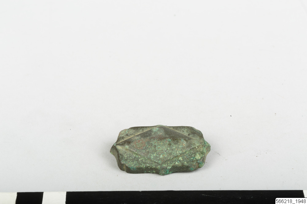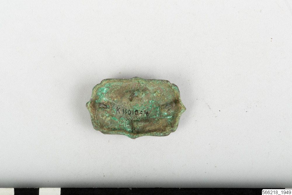 - Beslag, rektangulärt, dekorerad med rombformad upphöjning. Fyra nitar på baksidan.