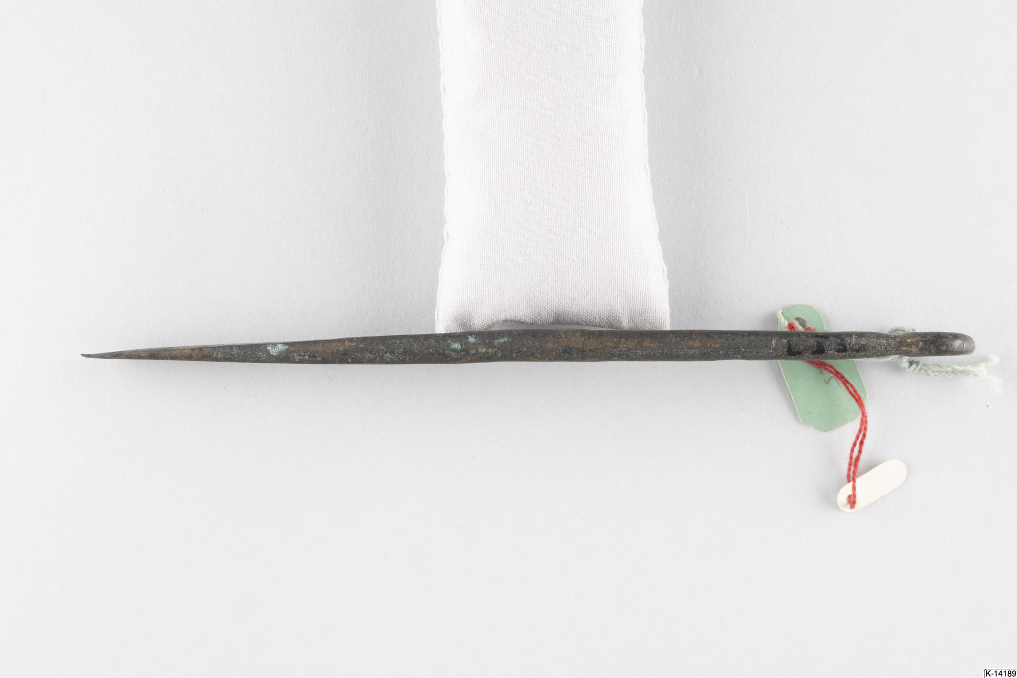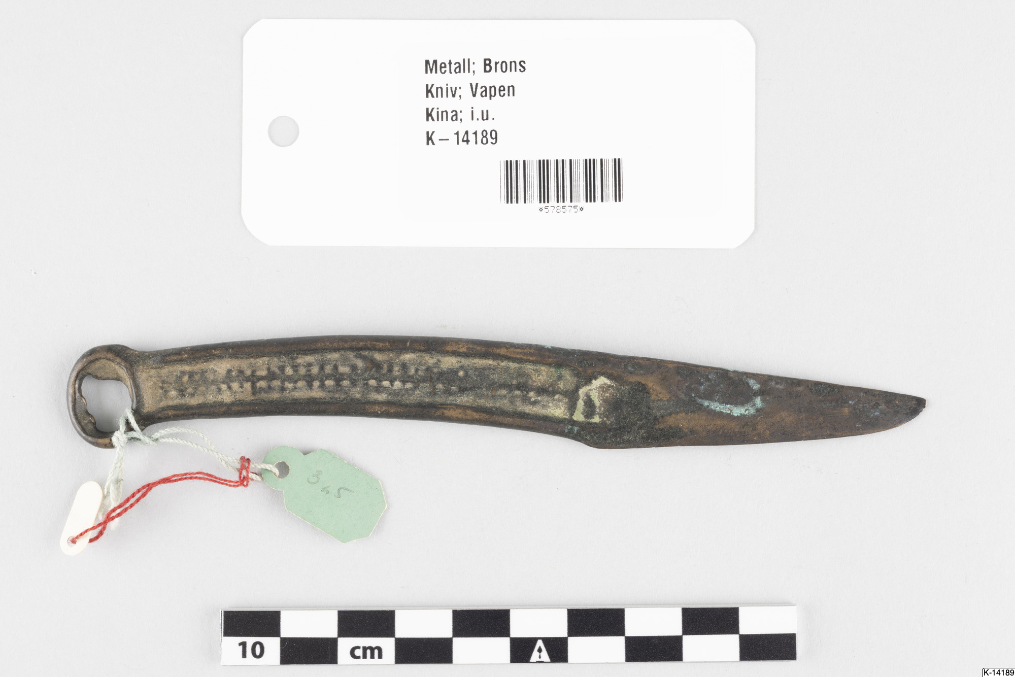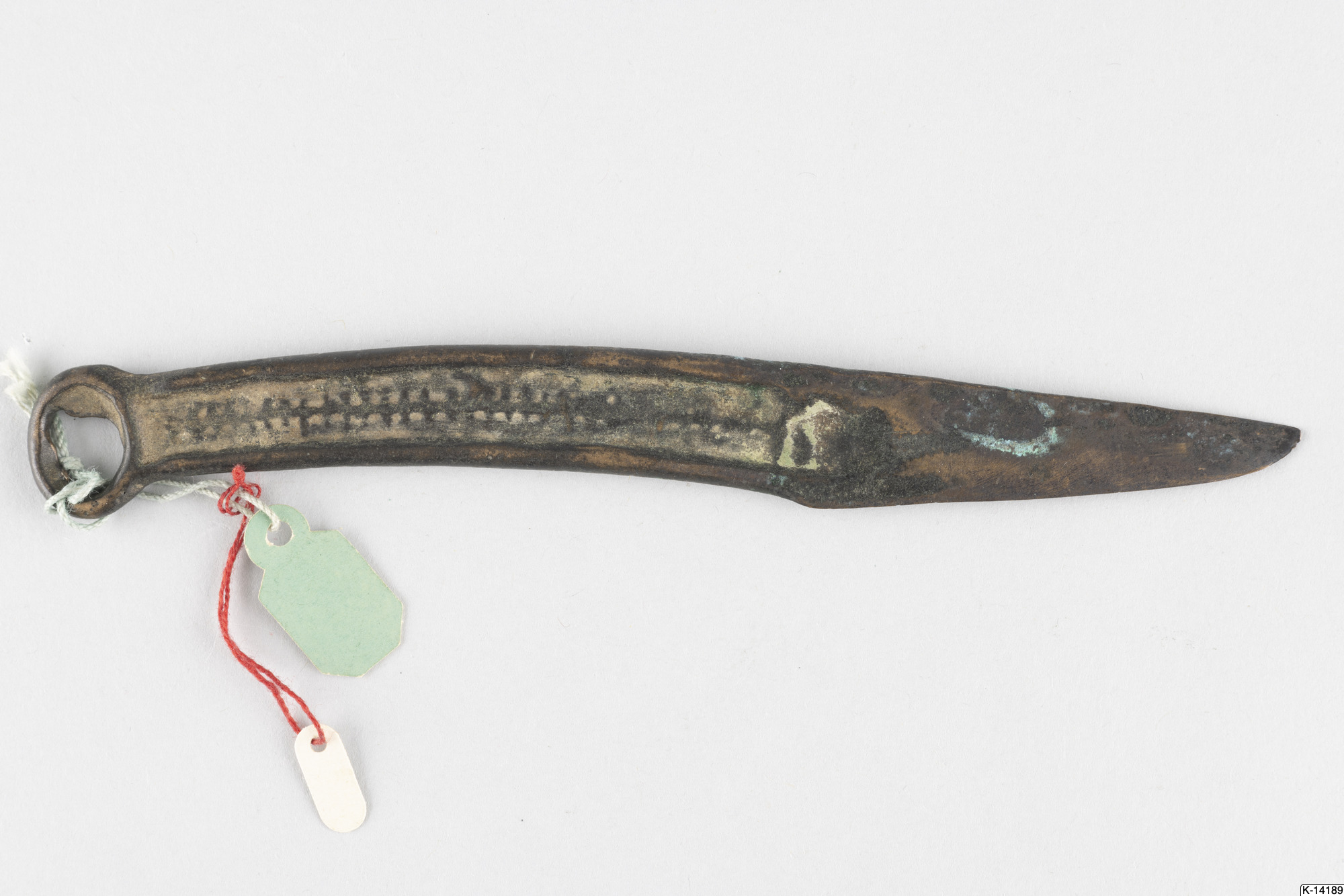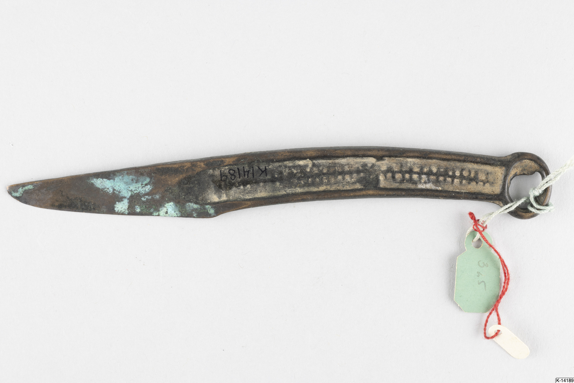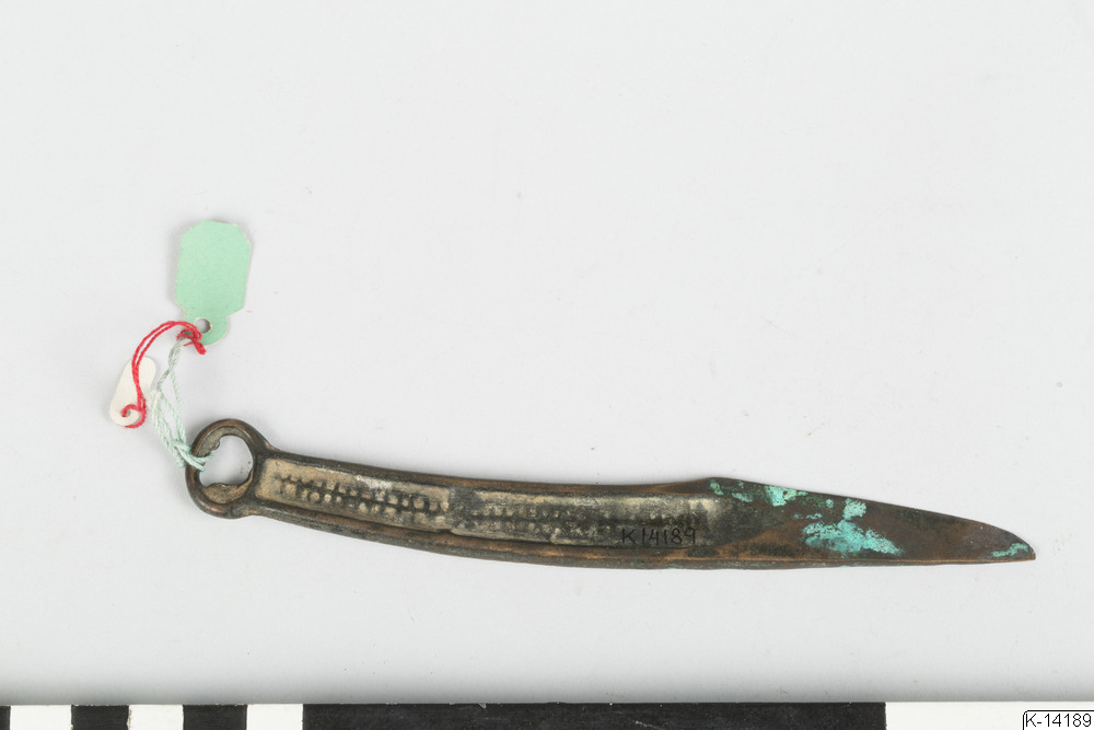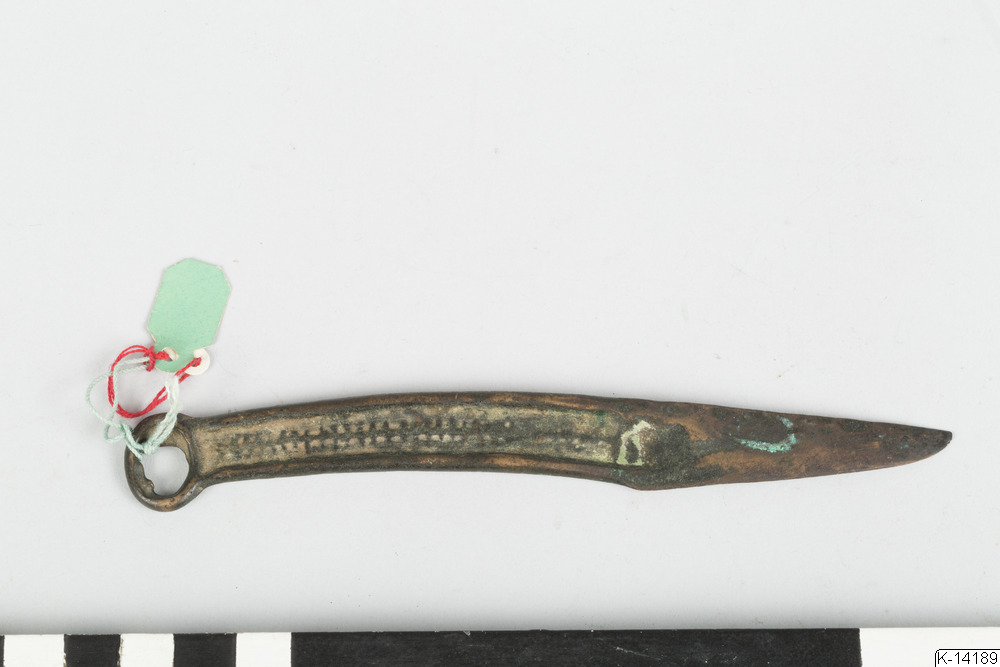 - Kniv av sibirisk typ. Något svängd rygg. Handtaget dekorerat på båda sidor med en längsgåedne linje, som korsars av små tvärstreck. Handtaget avslutas med en ring.