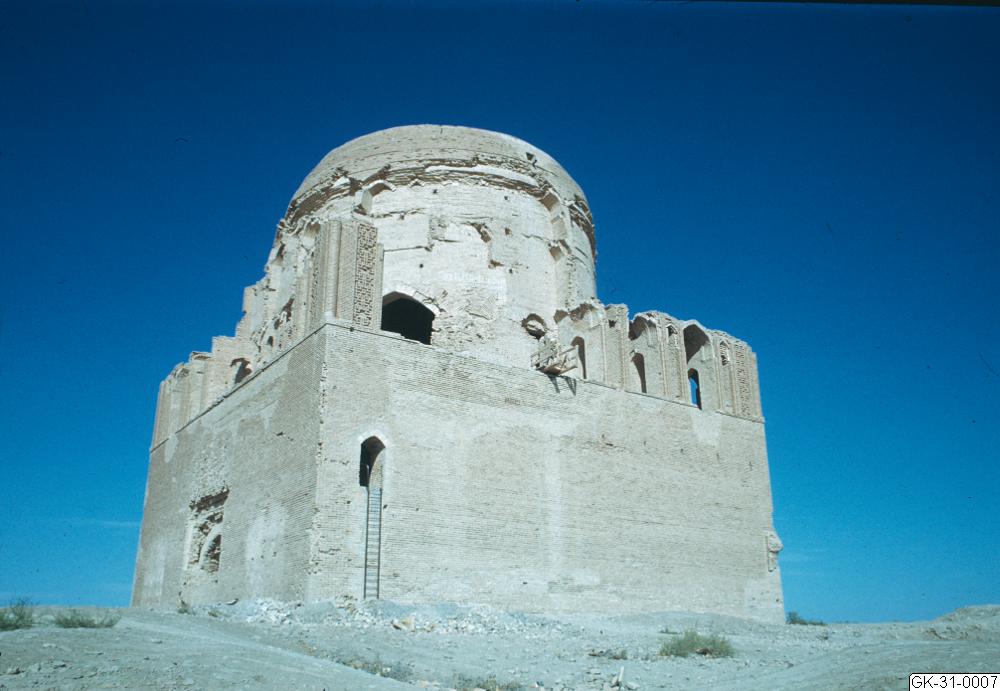 Motiv: Sultan Sanjars mausoleum. Hela byggnaden synlig mot blå himmel.