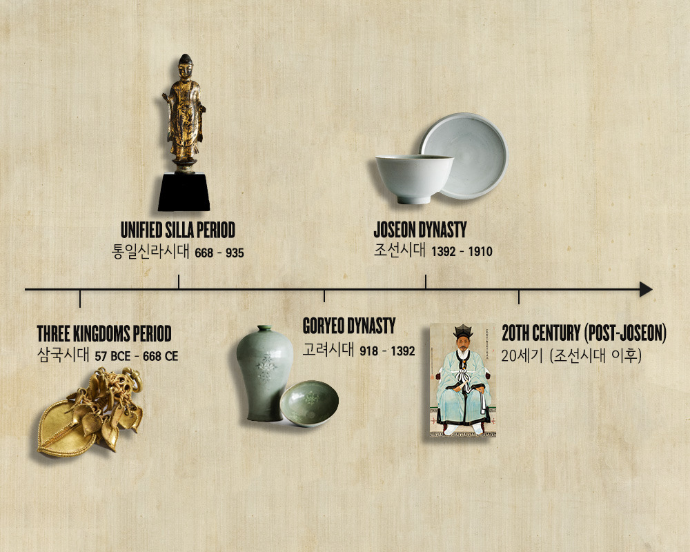 - Östasiatiska museets koreanska samling består av 510 föremål och fragment, samt 29 fotografier, och täcker ett tidsspann som sträcker sig från De tre kungarikenas tid (57 f. Kr – 668 e. Kr) fram till 1900-talet. Samlingen innehåller huvudsakligen keramik och metallföremål, men även ett antal målningar, kalligrafier och frottagemålningar, möbler i trä, textilier samt några lackarbeten och föremål i glas och sten. Grunden till samlingen består av föremål som donerades av kung Gustaf VI Adolf; den första officiella person i Sverige att intressera sig för koreansk konst och arkeologi. Han besökte Korea 1926 och gav under sin livstid ett antal föremål till museet. Fler föremål testamenterats sedan som gåva. Den största delen av den koreanska samlingen består av föremål som museet införskaffade under 1970- och 1980-talet genom inköp och gåvor från läkare och sjuksköterskor som arbetat på det svenska Röda korsets sjukhus i Busan under och efter Koreakriget (1950-1953), samt från svenska diplomater och affärsmän.