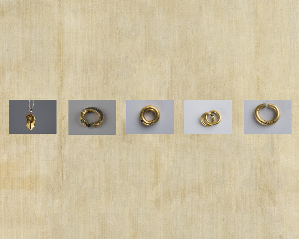 - I Korea börjar metallarbetet historia ungefär 1000 f. Kr när bronsgjutning introducerades som hantverksteknik på den koreanska halvön. Vid De tre kungarikenas tid tillverkades elaborerade metallarbeten i guld, silver, brons och järn, bland annat speglar, armband, örhängen, bälten och olika typer av kärl, vapen och rustningar. Under guldhantverkets storhetstid mellan 400-talet och 600-talet var kungadömet Silla känt som "Riket av guld" på grund av den stora mängd praktfulla regalier av guld som då tillverkades. Föremålen i den här delen av samlingen visar bara upp en bråkdel av den stora mängd skatter som hittats i gravar från kungadömet Silla, men ger ändå en inblick i hantverksskickligheten under den här tiden. Ett gott exempel på detta är örhängena i guld (no. 1) med lövformade hängen, sirligt dekorerade med sågtandade kanter och med filigranarbete i guldtråd. Ofta fästes kommaformade jadepärlor på prydnader och smycken i guld.