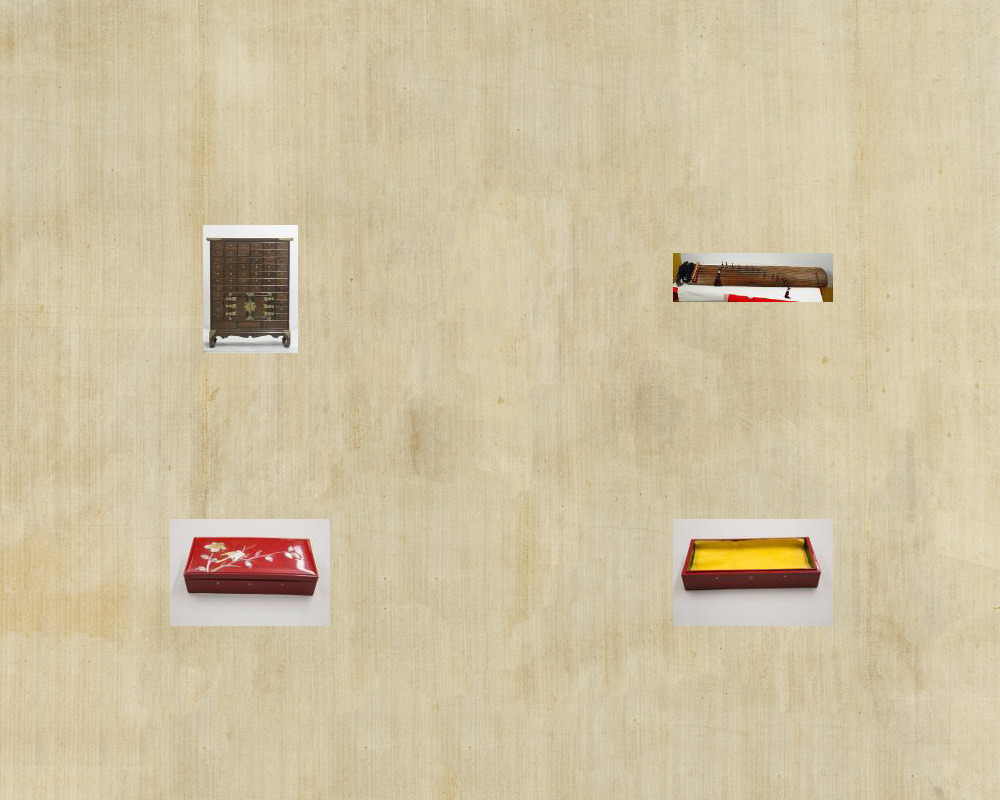 I dagsläget finns bara en möbel, ett musikinstrument, (Gayageum) och en traditionell ask med lock med pärlemorinlagt arbete i samlingen. Östasiatiska museet har dock planer på att komplettera samlingen med fler föremål.