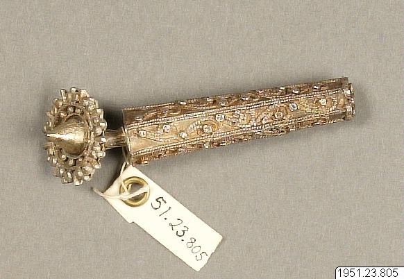 Öronsmycke för kvinna. Begagnas vid fester. Boegis-arbete. Myntsilver lär blandas med guld. Troligen använt som par med föreg. nummer. Orig. nr 1375.