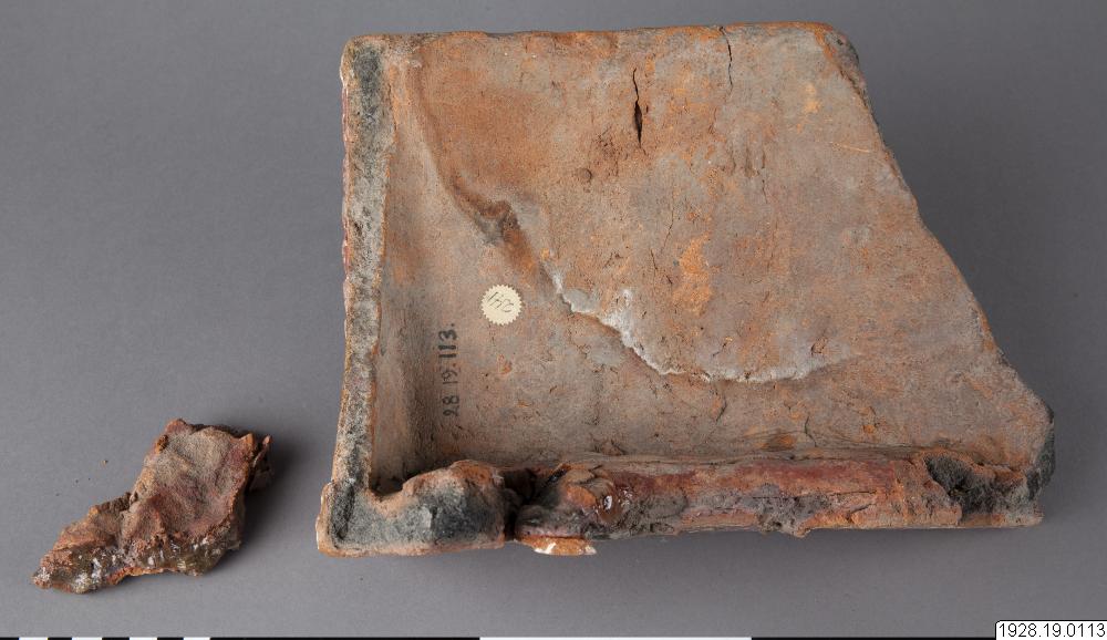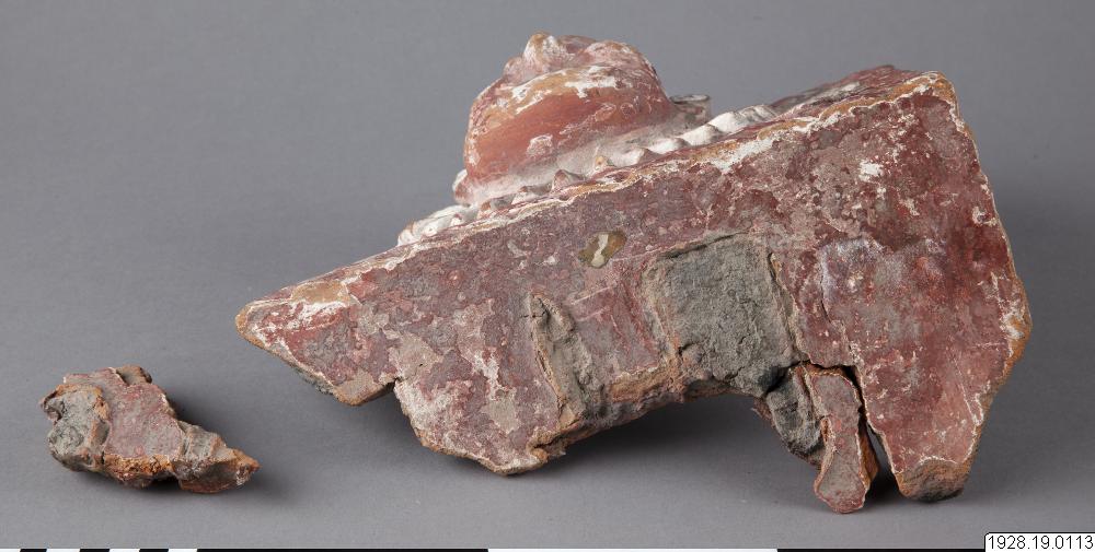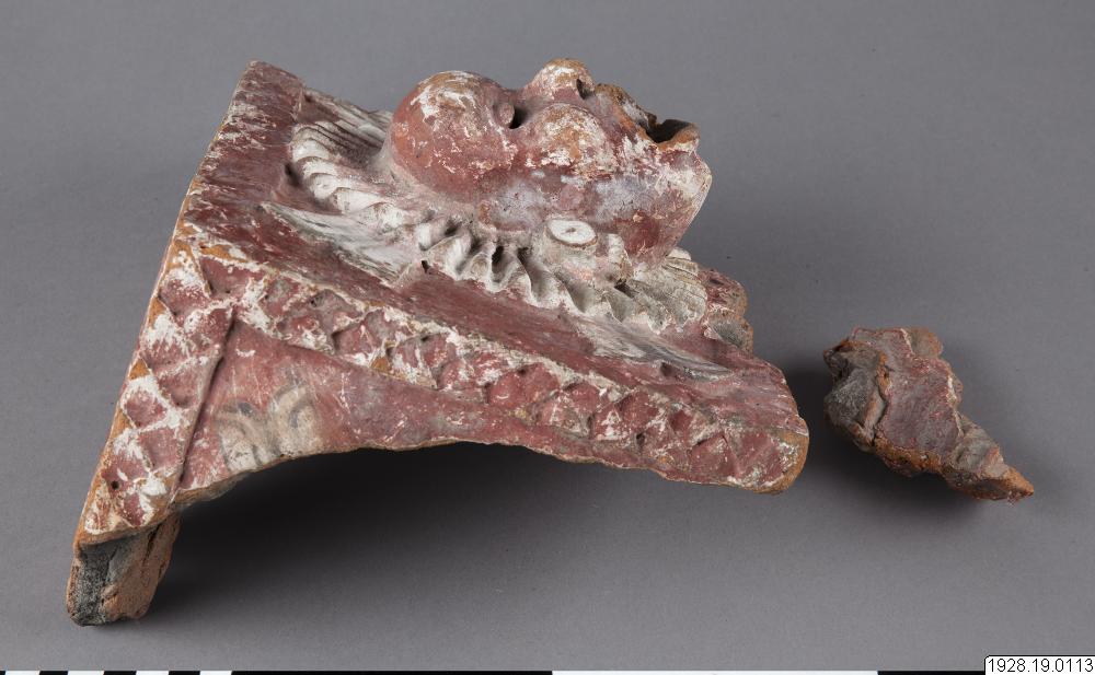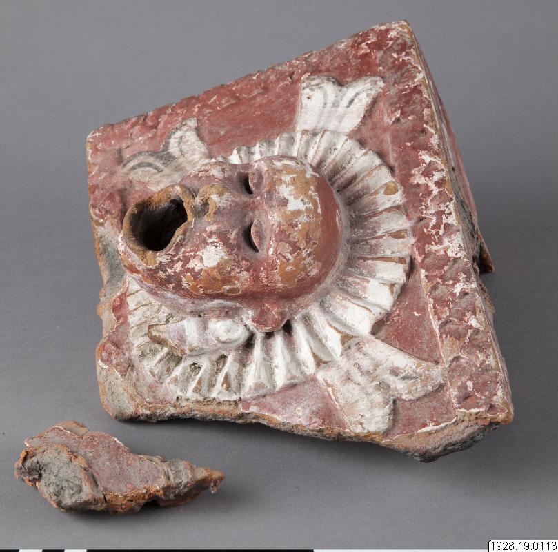 - Del av byggnadsdekoration. Av lergods. Föreställer guden Xipe.